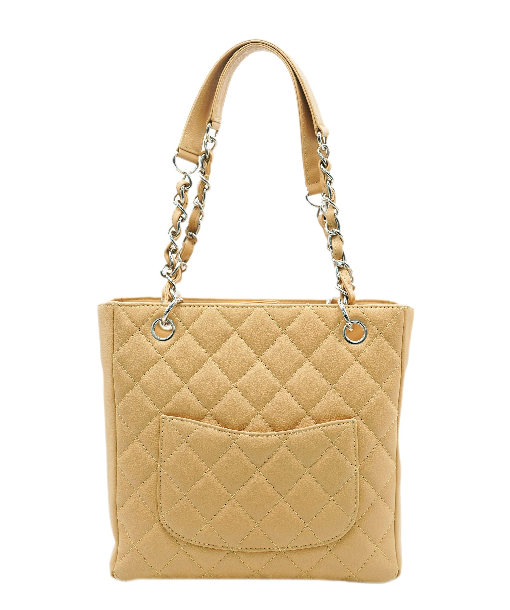 Description: This 2005 Chanel Petite Shopping Tote combines classic elegance with practicality. Crafted from durable caviar leather, it features a streamlined shape adorned with the iconic CC logo and a luxurious quilted pattern. This tote is perfect for those who value both style and functionality.
