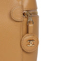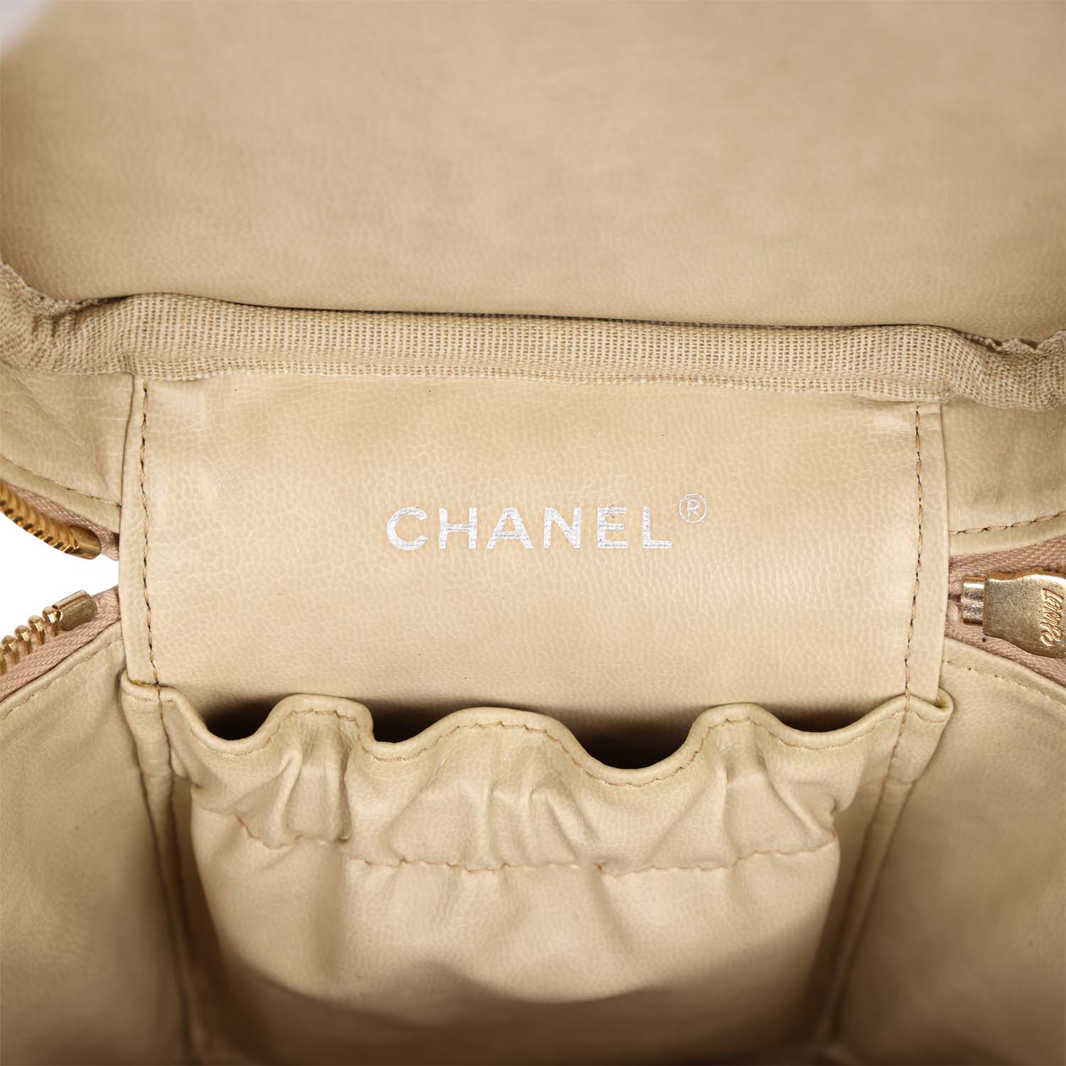 This Vintage Vanity is in Dark Beige Caviar with Gold hardware and features the CC logo on front, zip closure, tonal stitching, and top handle.
