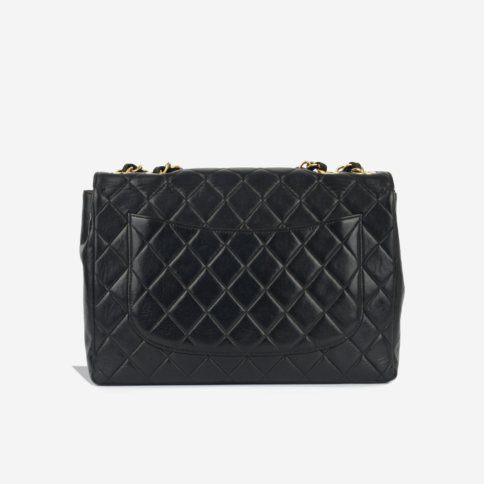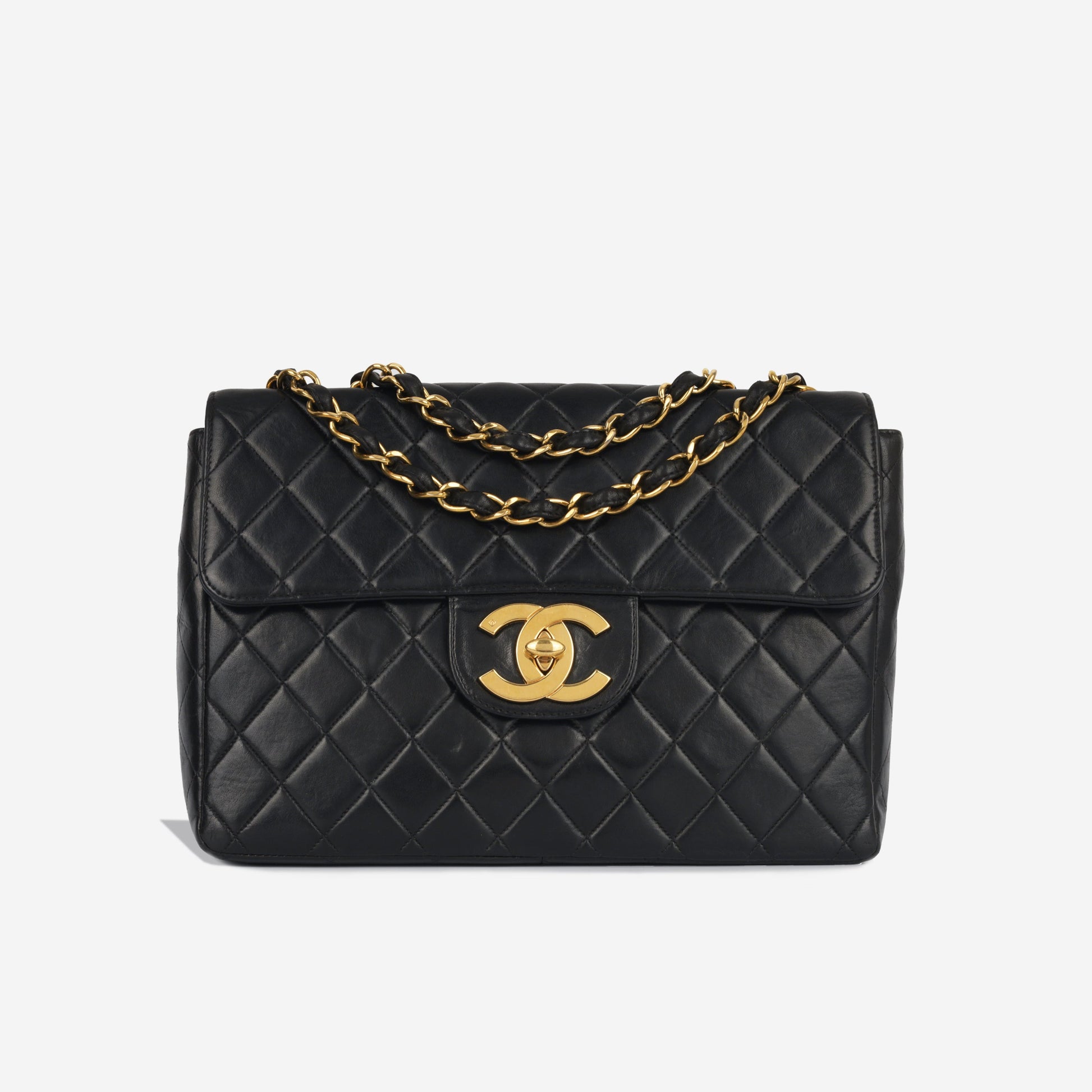 For all the vintage Chanel lovers, this one's for you. This rare XL Classic Flap is definitely not easy to find. With its smooth, quilted lambskin leather, gold tone hardware and XL CC logo clasp, this bag is elegant and sophisticated. Ideal for day-to-night usage, you can fit your whole world comfortably inside. Timeless, classic and the ultimate addition to any luxury handbag collection, this vintage gem is a true must-have.