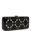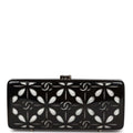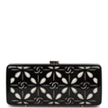 This Minaudiere clutch is of Black acrylic and White leather with silver hardware, top CC snap closure, cut out "CC" monograms with flower design, and an optional long silver chain that can be tucked away.