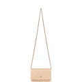 This Wallet on Chain is of beige caviar with gold tone hardware and has a front flap with CC emblem, half moon back pocket and long silver gold tone metal and beige leather chain.