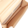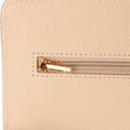 The interior is lined in beige leather and fabric and features a top zipper pocket under flap, a slit front pocket, a zipper compartment with leather pull, and an open pocket with six credit card slots.