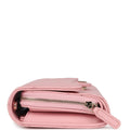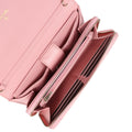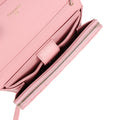 The interior is lined in pink leather and grosgrain fabric and features a top zipper pocket under flap, a slit front pocket, a zipper compartment with leather pull, and an open pocket with six credit card slots.