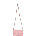 This Chanel Wallet on Chain is in pink caviar with light gold tone hardware and has a front flap with a textured CC emblem, and a removable long light gold tone metal and pink leather chain.