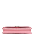 This Wallet on Chain is in Pink Caviar with gold hardware, signature half moon exterior back pocket, tonal chain-link crossbody strap/shoulder strap, and front CC gold tone button closure.