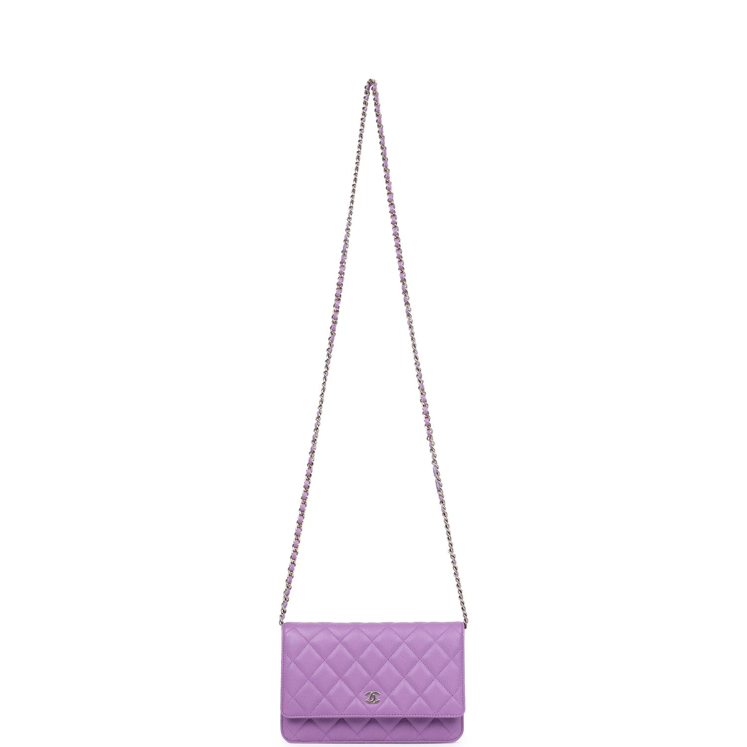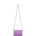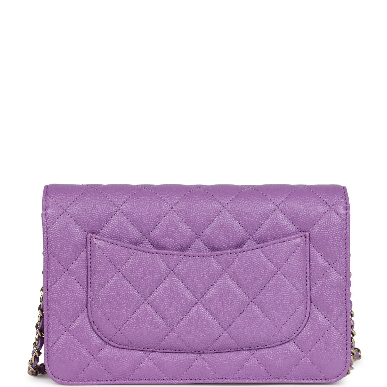 This Wallet on Chain is in purple caviar leather with light gold hardware, signature half moon exterior back pocket, tonal chain-link crossbody strap/shoulder strap, and front CC silver-tone button closure.