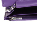 This Wallet on Chain is in Purple Lambskin Leather with silver hardware, signature half moon exterior back pocket, tonal chain-link crossbody strap/shoulder strap, and front CC silver-tone button closure.