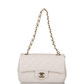 The interior is lined in white leather and features a zipper pocket with Chanel pull and an open pocket below.