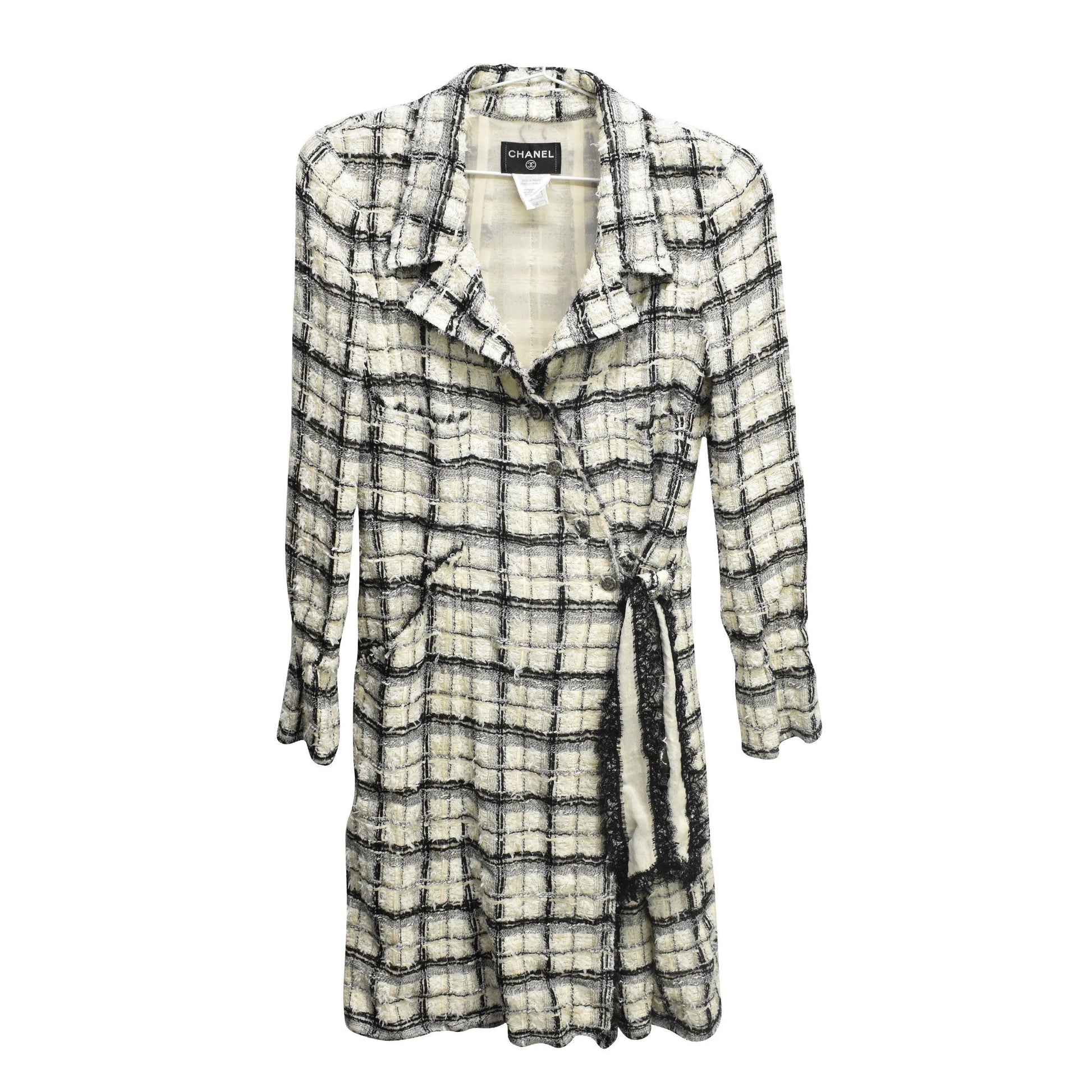 Chanel black and white tweed dress with black lace trim and full white silk lining. The dress buttons up asymmetrically with silver crested buttons and has a short tie at the waist. Features a notched collar, slightly flared cuffs, and pockets one the hips and chest.