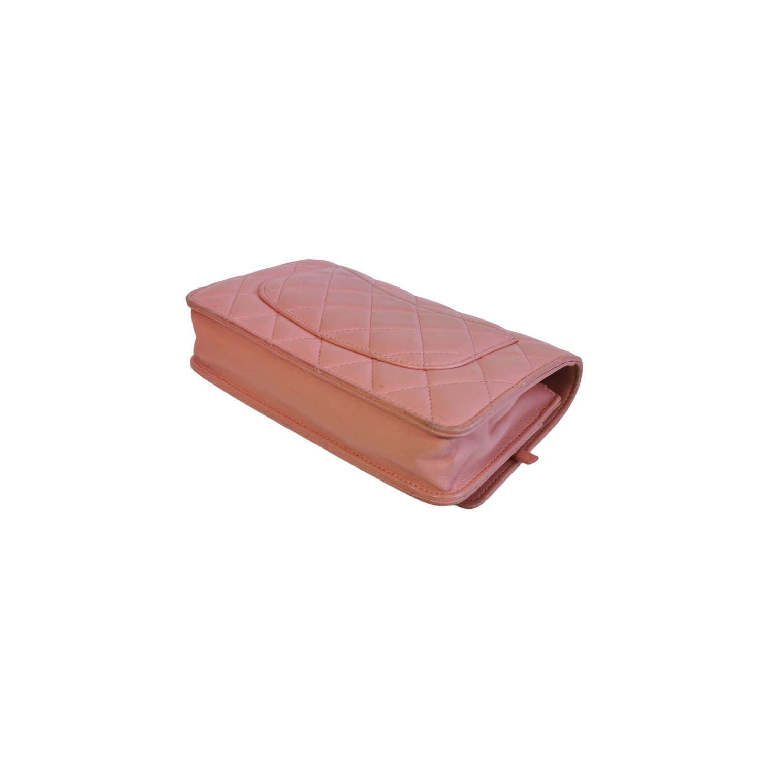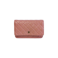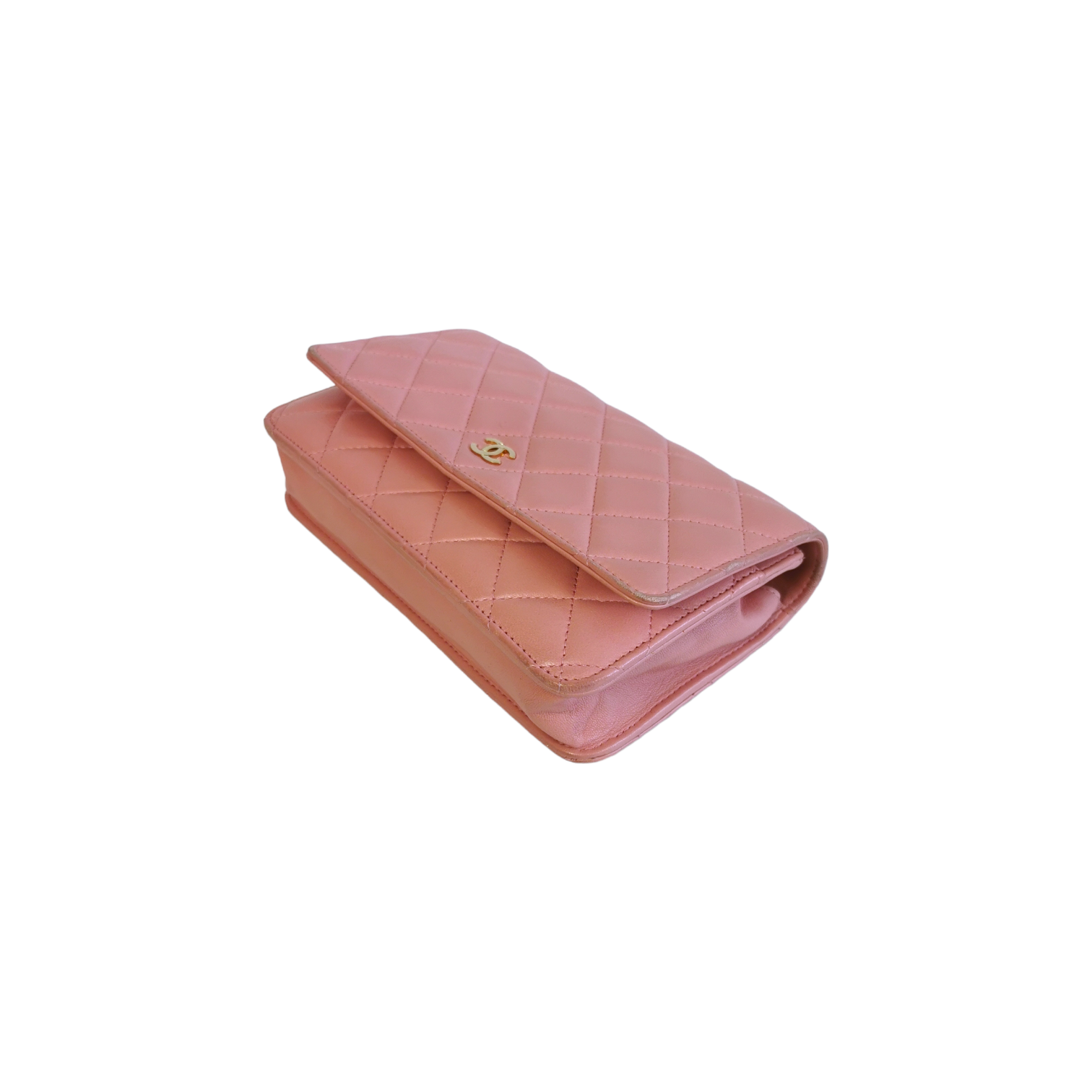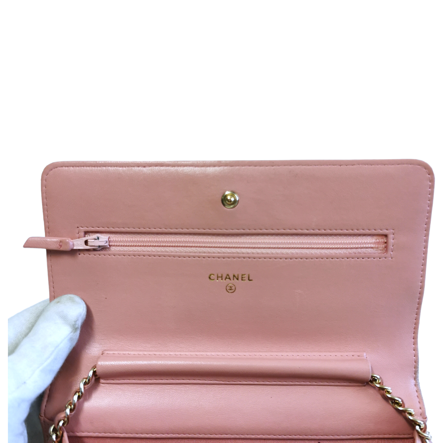 The Chanel Wallet on Chain (WoC) in Pink Lambskin with Gold hardware is a stunning accessory that effortlessly combines femininity and luxury. The delicate pink lambskin leather showcases Chanel's impeccable craftsmanship, while the gold hardware adds a touch of opulence. This compact yet functional piece features multiple card slots, a zip compartment, and a chain strap that allows for versatile styling options. Perfect for day or evening occasions, the Chanel WoC in Pink Lambskin and Gold is a must-have addition to any fashion lover's collection.