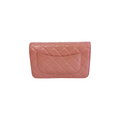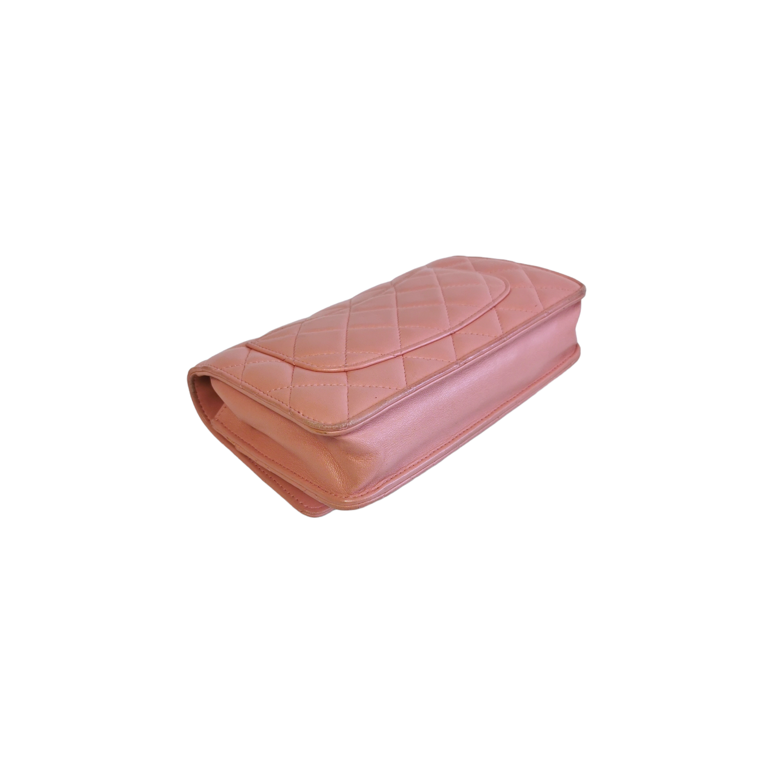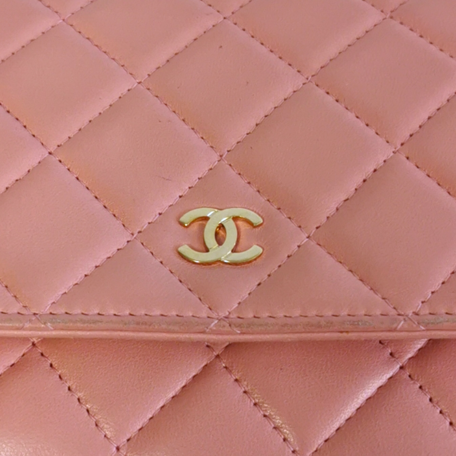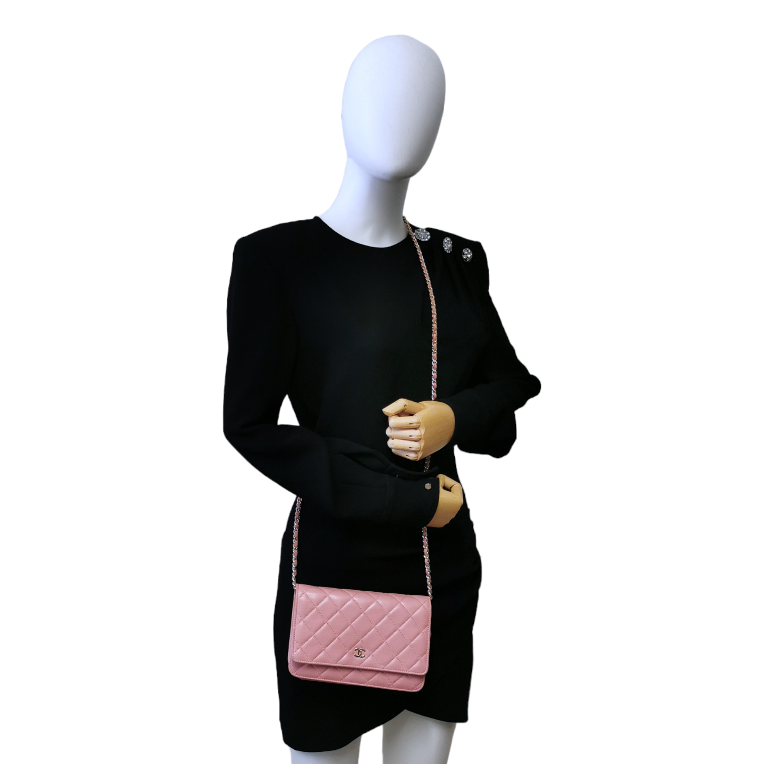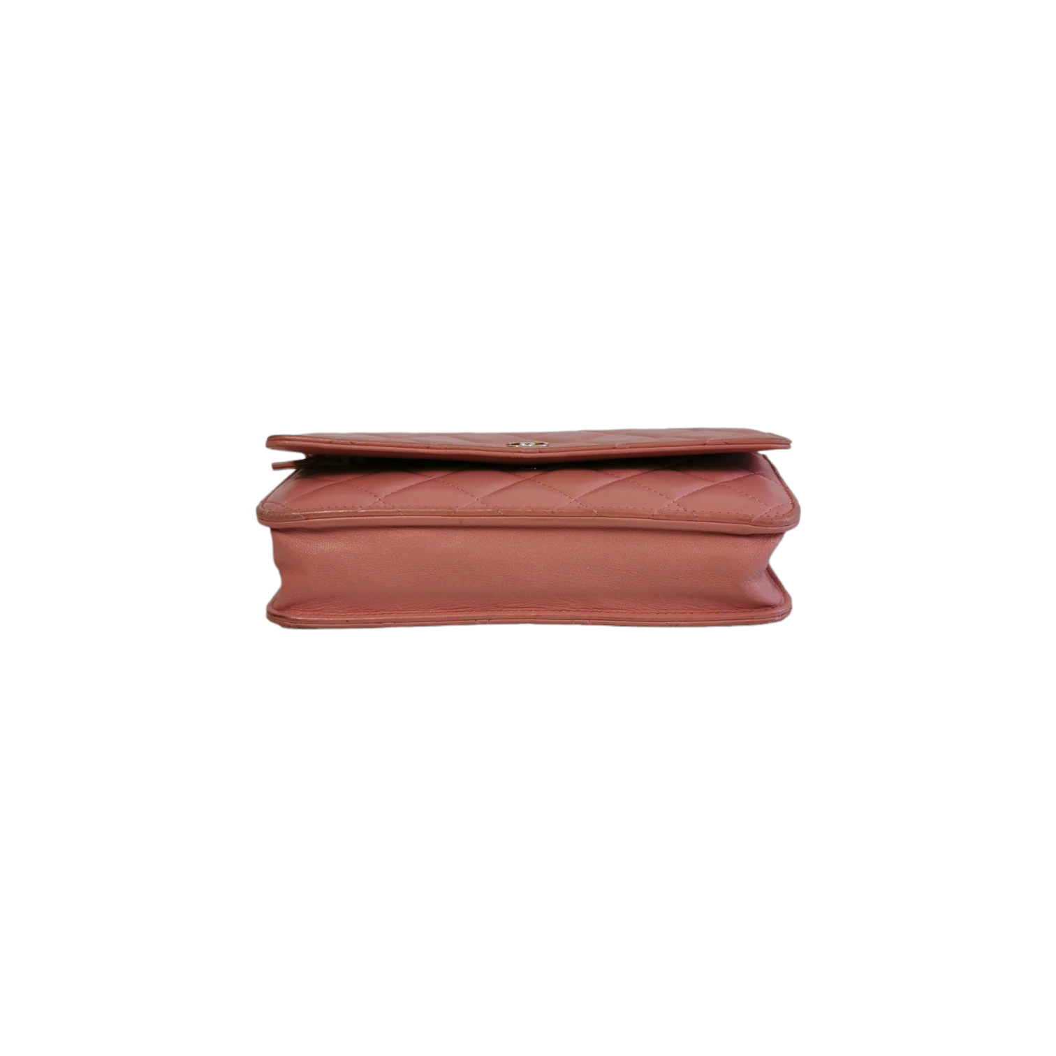 The Chanel Wallet on Chain (WoC) in Pink Lambskin with Gold hardware is a stunning accessory that effortlessly combines femininity and luxury. The delicate pink lambskin leather showcases Chanel's impeccable craftsmanship, while the gold hardware adds a touch of opulence. This compact yet functional piece features multiple card slots, a zip compartment, and a chain strap that allows for versatile styling options. Perfect for day or evening occasions, the Chanel WoC in Pink Lambskin and Gold is a must-have addition to any fashion lover's collection.