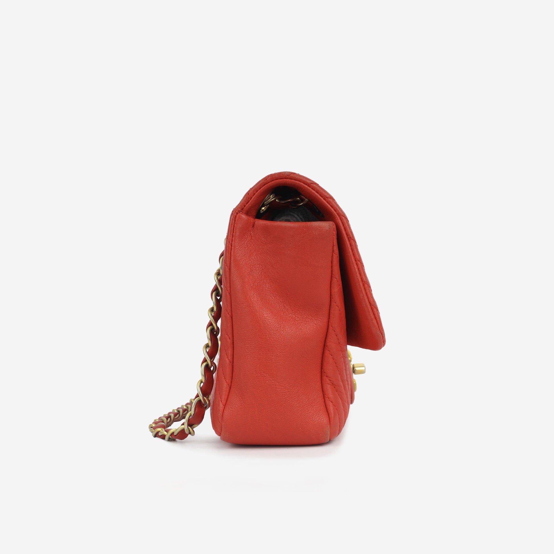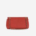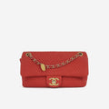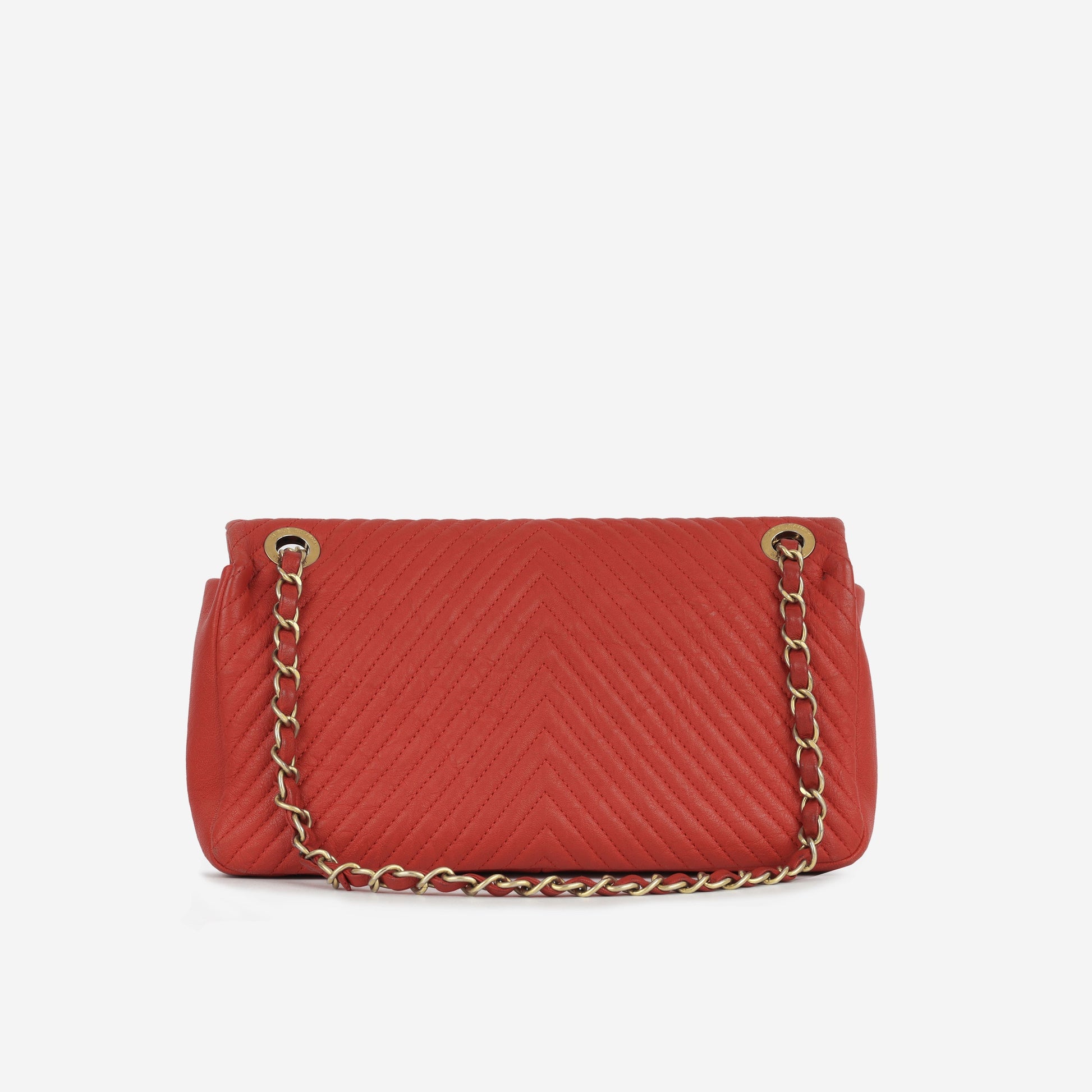Carefully crafted in red aged calfskin with a chevron design, this Flap bag is the ideal companion to take you from day to night. Carry all your daily essentials inside the spacious interior while remaining sleek and sophisticated. Featuring luxurious gold tone hardware and interwoven leather-chain strap, you can wear this piece with anything you have in your wardrobe. Effortlessly chic and always in style, it's safe to say you need it in your life.