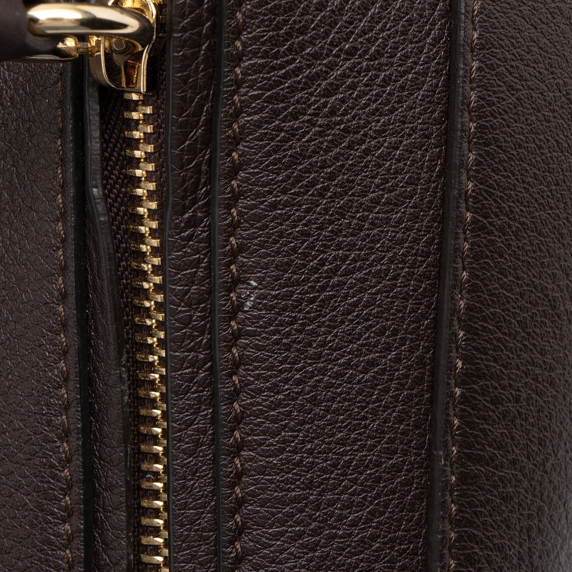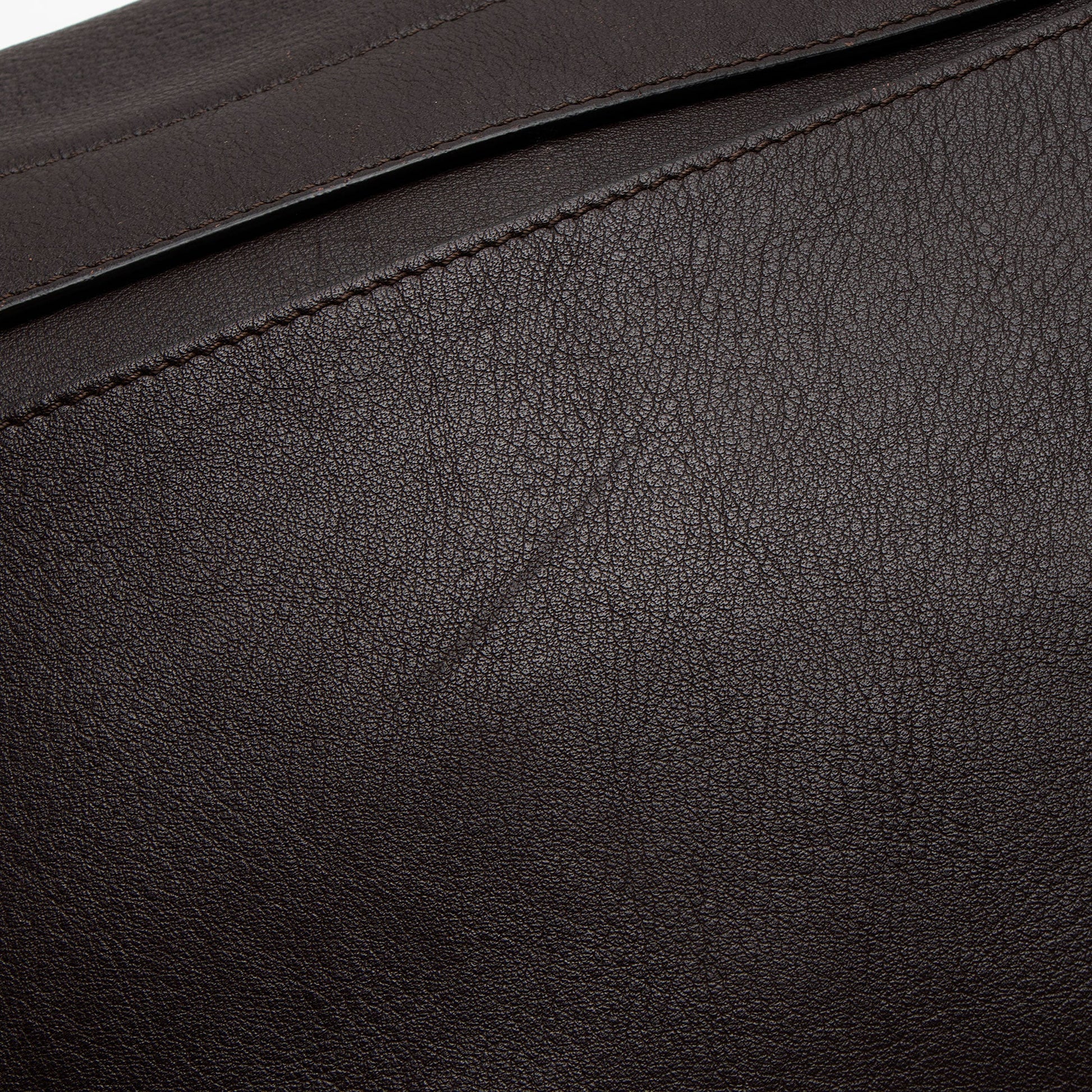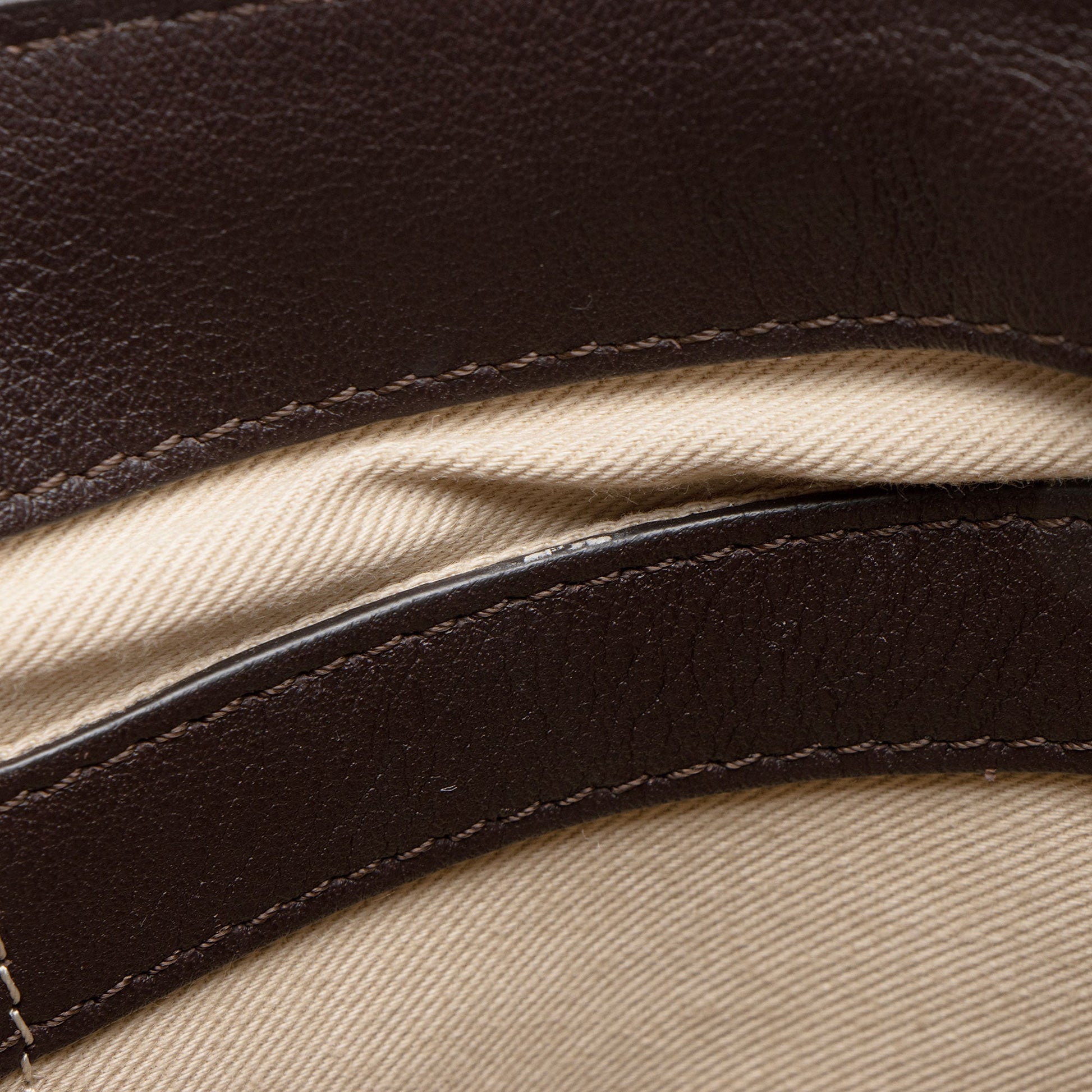 Condition Notes: Light scuffs to exterior bottom corners. Minor scuffs throughout exterior. Surface scratches and minor tarnishing to hardware. Visible scuffs and light imprints to interior front calfskin by closure. Light marks and wear throughout interior. Please note: Read product details carefully. This is a dark brown bag.