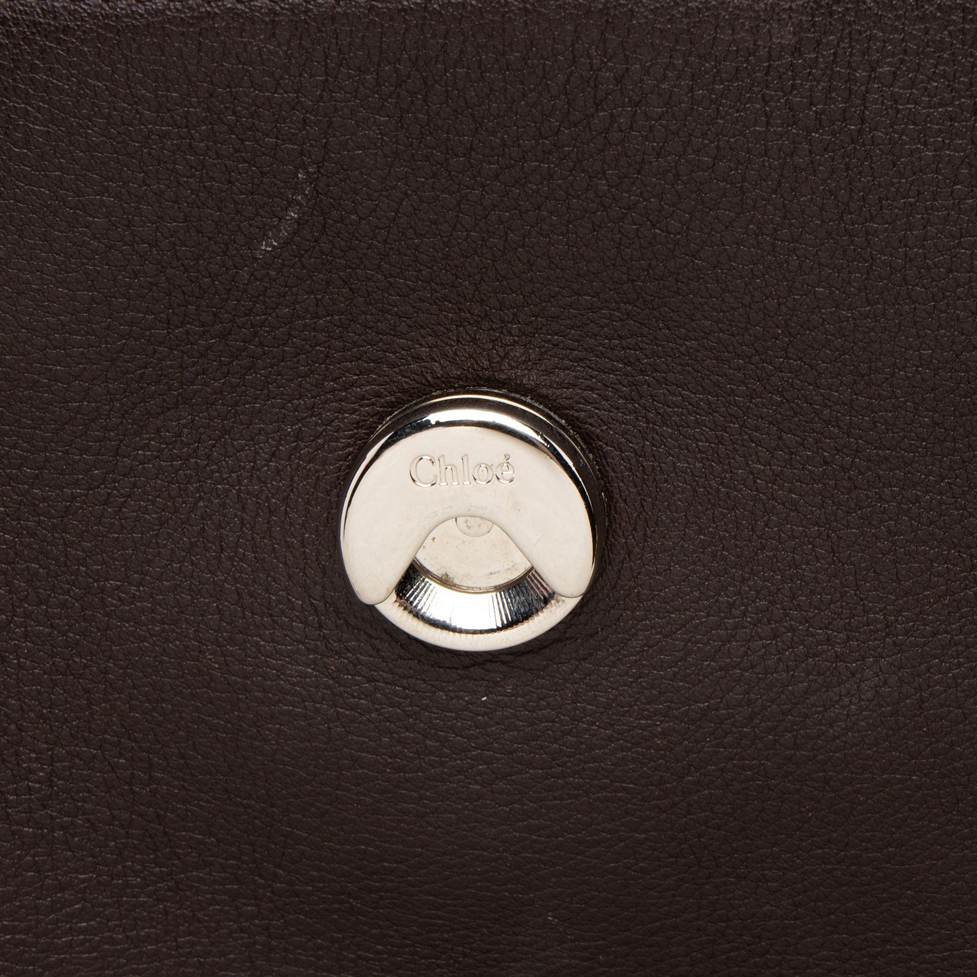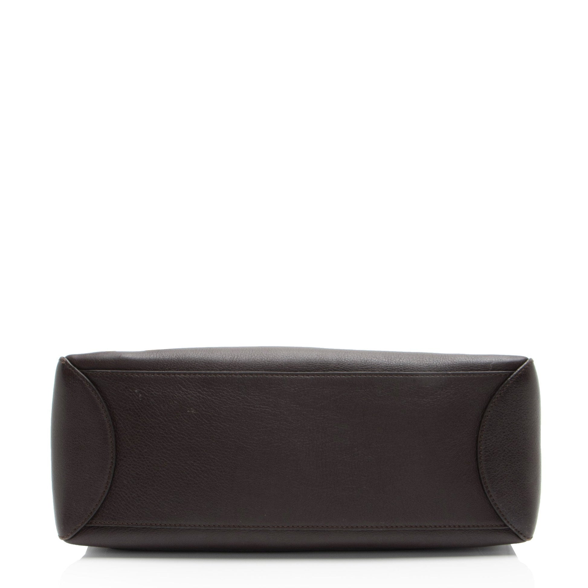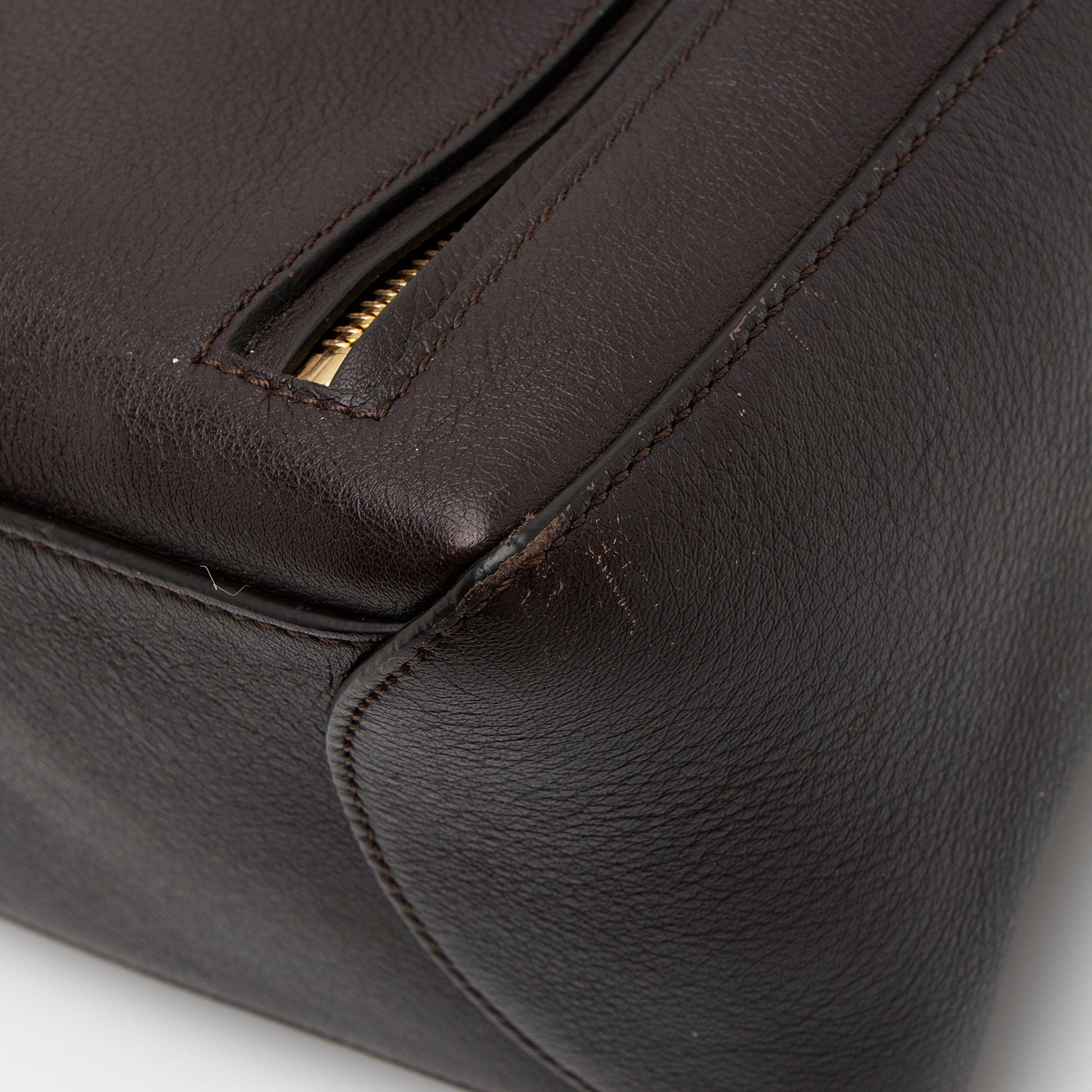 Condition Notes: Light scuffs to exterior bottom corners. Minor scuffs throughout exterior. Surface scratches and minor tarnishing to hardware. Visible scuffs and light imprints to interior front calfskin by closure. Light marks and wear throughout interior. Please note: Read product details carefully. This is a dark brown bag.