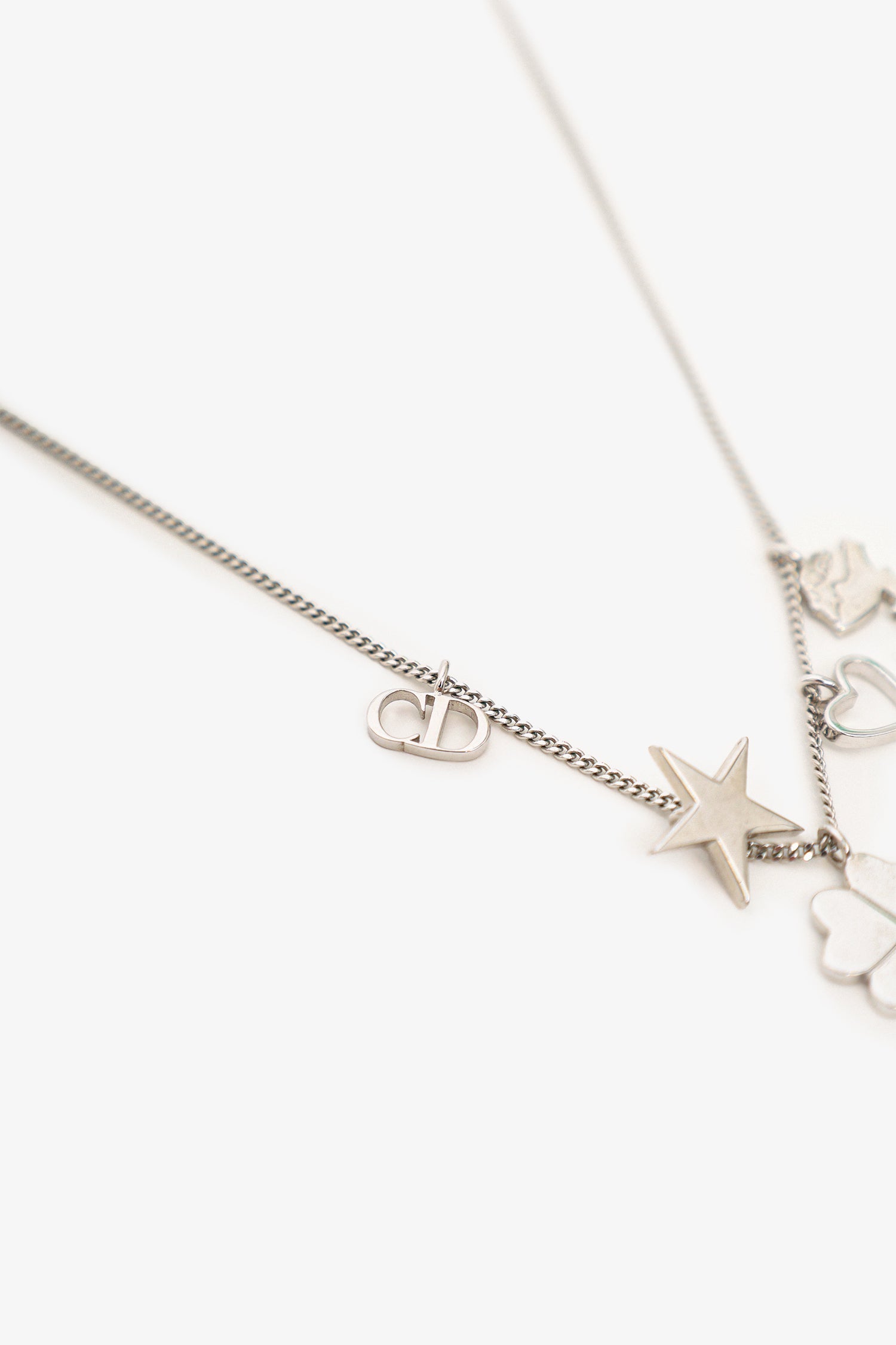 Christian Dior Silver Tone Four Leaf Clover/Star/Heart Charm Necklace. Rear clasp closure. Silver-tone hardware.