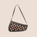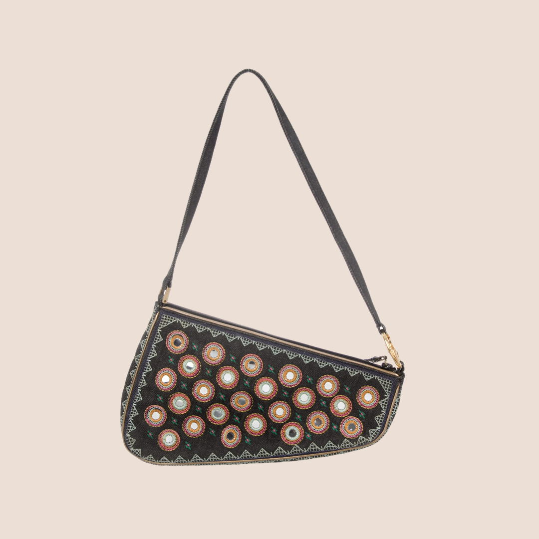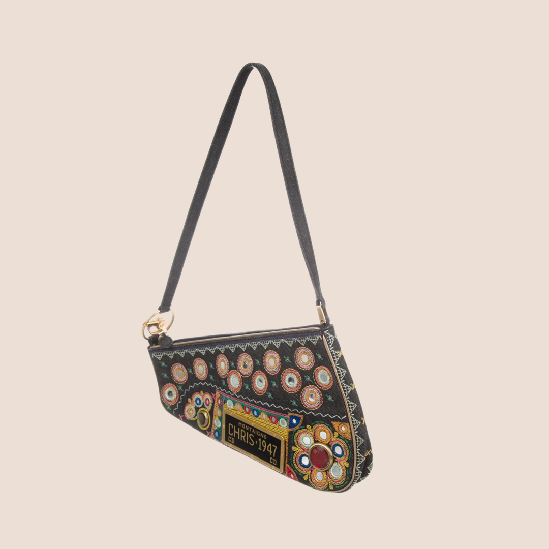 This bag features gold-tone hardware, single flat shoulder strap, multicolor embroidered mirror adornments throughout exterior 'Montaigne Chris 1948' placard at front face, black satin interior lining, single zip pocket at interior wall and zip closure at top.