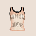 Vintage Christian Dior Spring 2002 Gothic Logo Mesh top in nude with knit trim and gothic lettering.