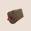 This bag features brown printed canvas, silver-tone hardware, multicolour leather trim embellishment, rolled red leather handles and dual interior pockets.