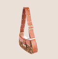 The bag features gold-tone hardware, cinnamon leather trim, single flat shoulder strap, detachable flap compartment at side with snap closure, single slit pocket at back, grommet embellishments at exterior, chocolate logo jacquard lining, single zip pocket at interior wall and magnetic snap closure at front flap.