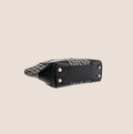 The tote features silver-tone hardware, flat handles, leather trim embellishment, nylon lining and zip closure at top.