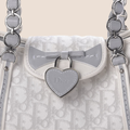 This rare bag features neutral colours, Diorissimo pattern, silver-tone hardware, chain-link handles, bow & heart padlock detail, satin lining and single interior pocket.