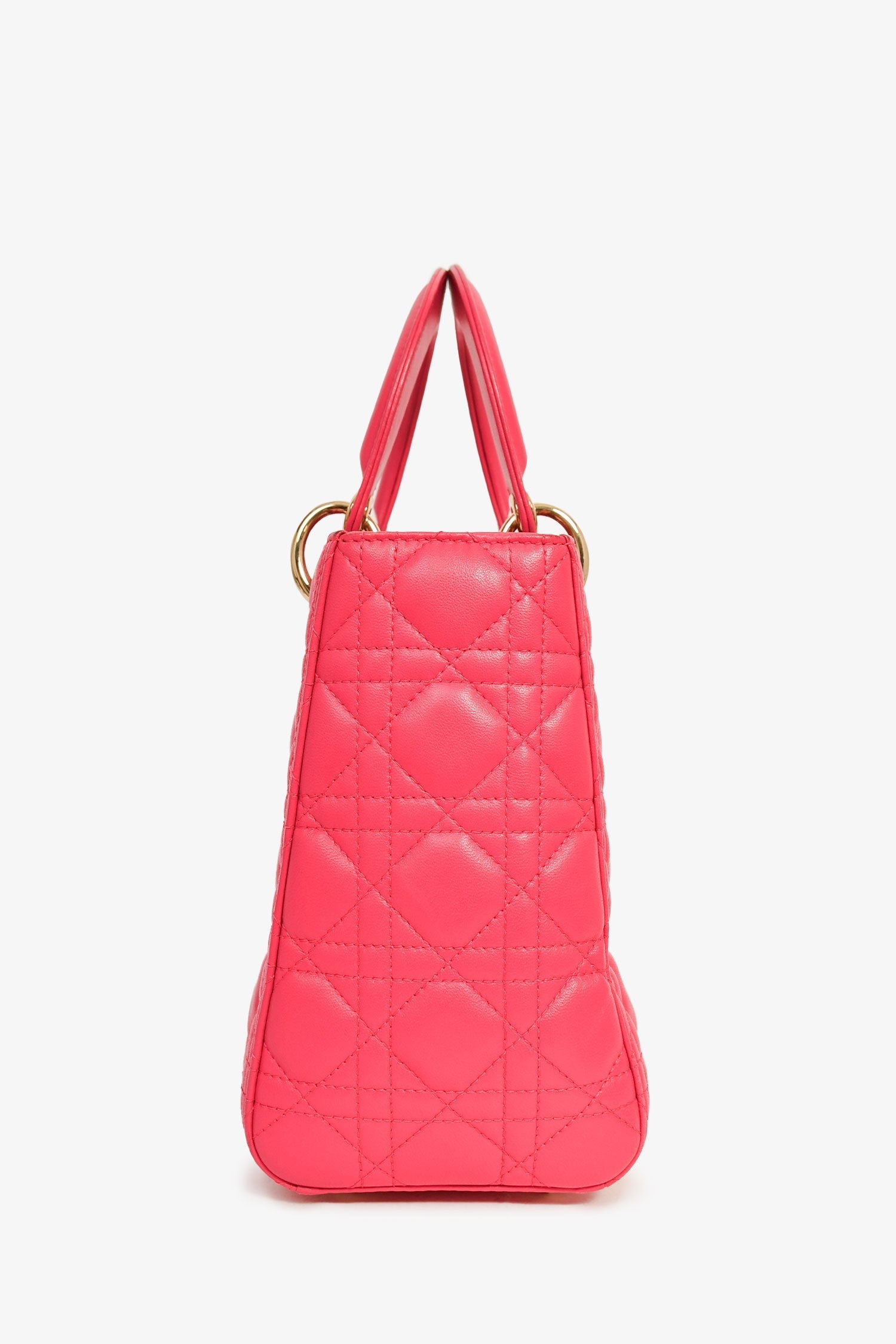 Christian Dior 2013 Pink Leather Medium 'Lady Dior' Top Handle Bag. Gold-tone hardware. 2 flap top handles. 'DIOR' charms. Lined interior with a zipped compartment. Comes with an attachable strap. Tonal stitching.