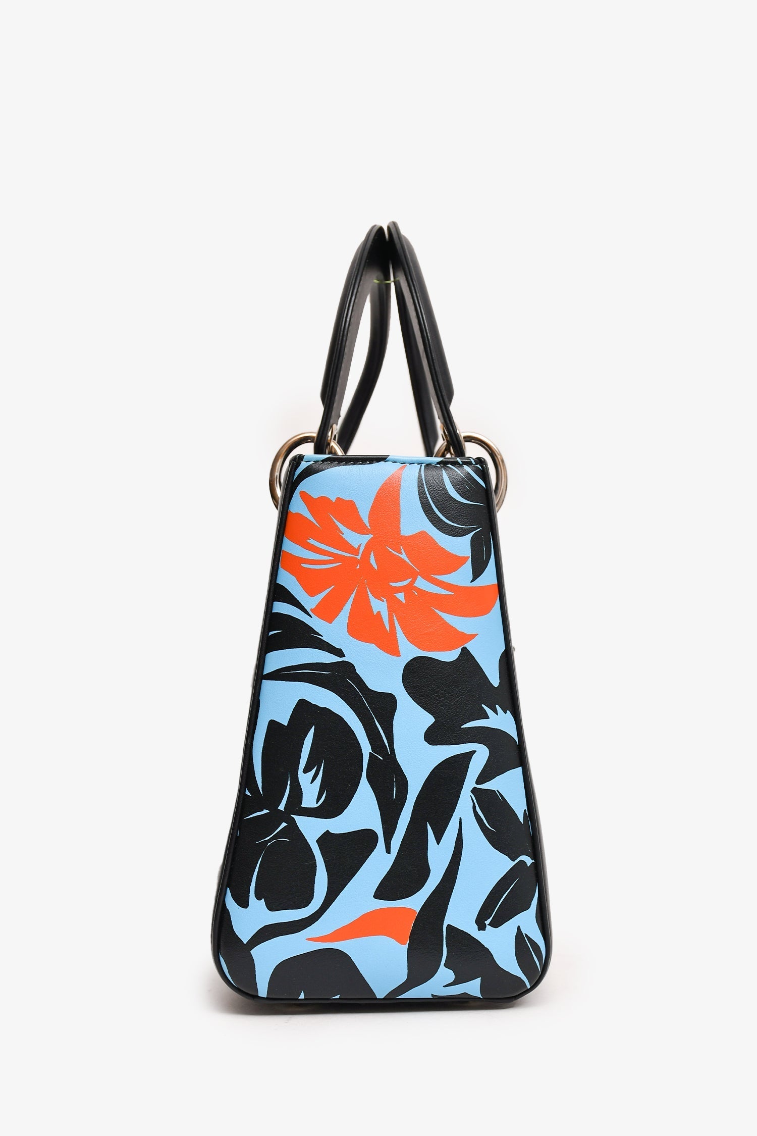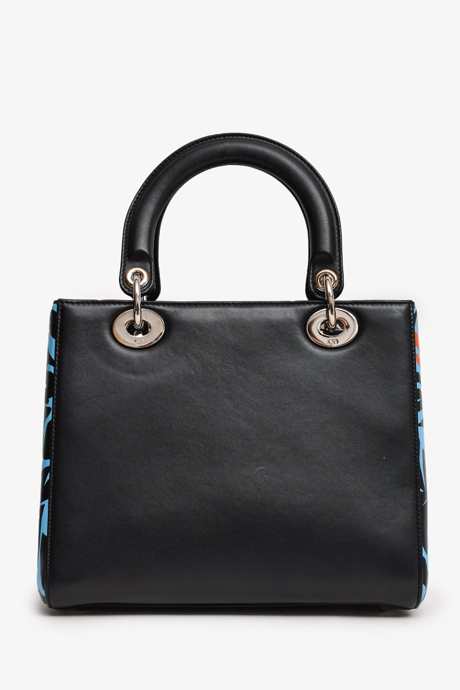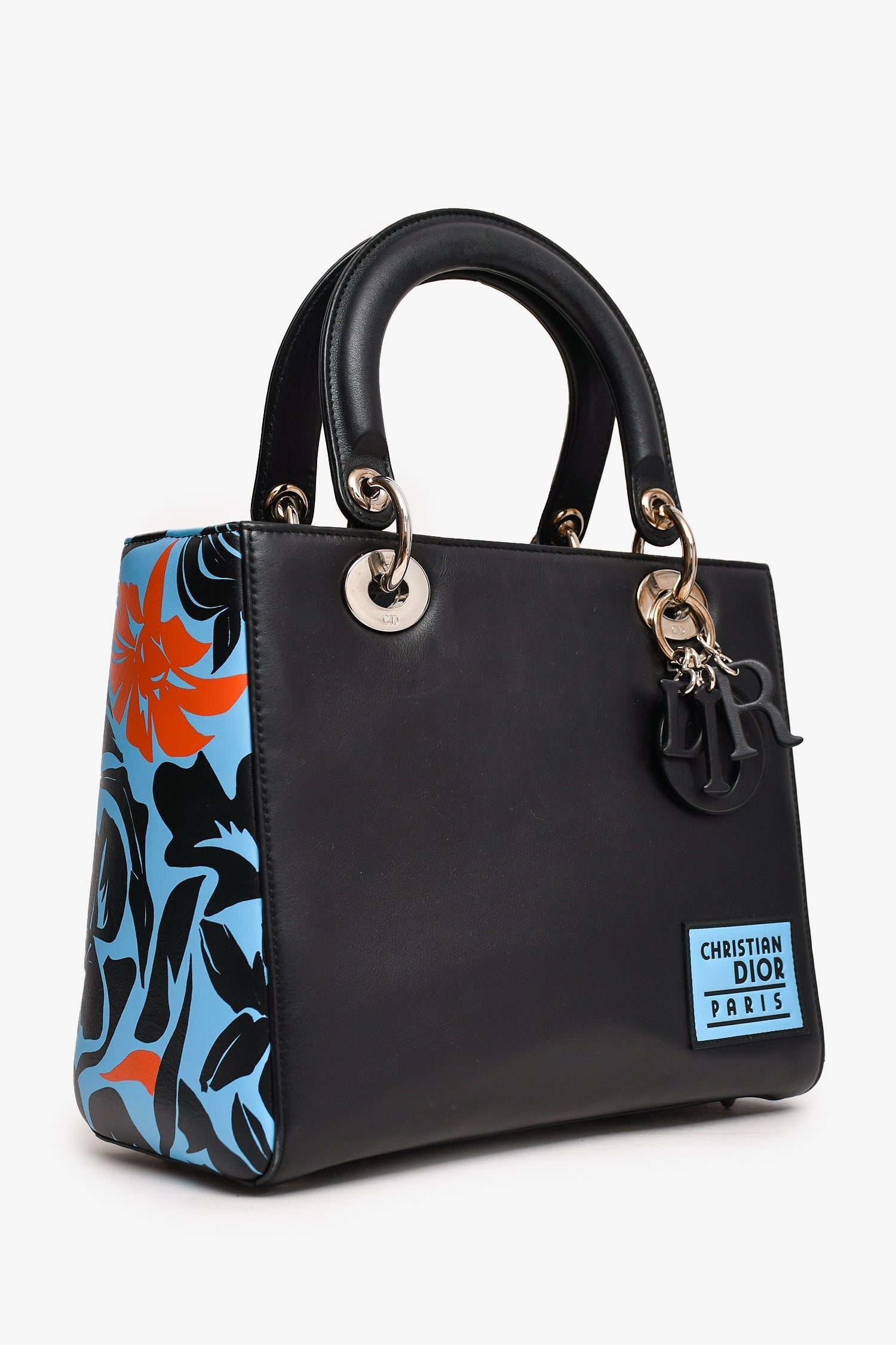 Christian Dior 2016 Black/Blue Leather Floral Printed Lady Dior. Silver-tone hardware. Flat top handles with a chain-link attachment. Leather 'DIOR' charms. Blue/orange floral motif at the sides. Bag feet at the base. Upper zipped fastening. Interior zipped compartment. Comes with a strap.
