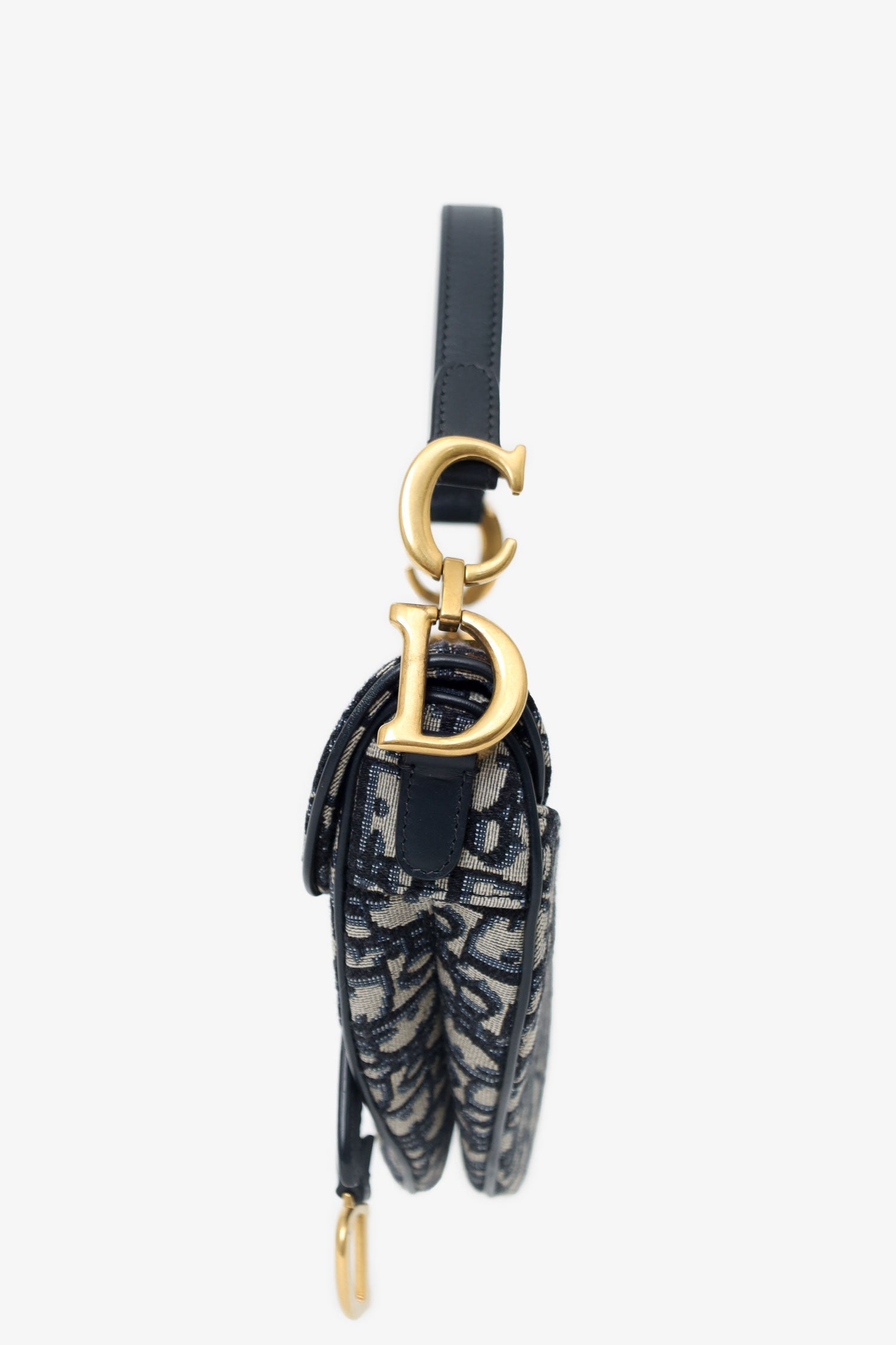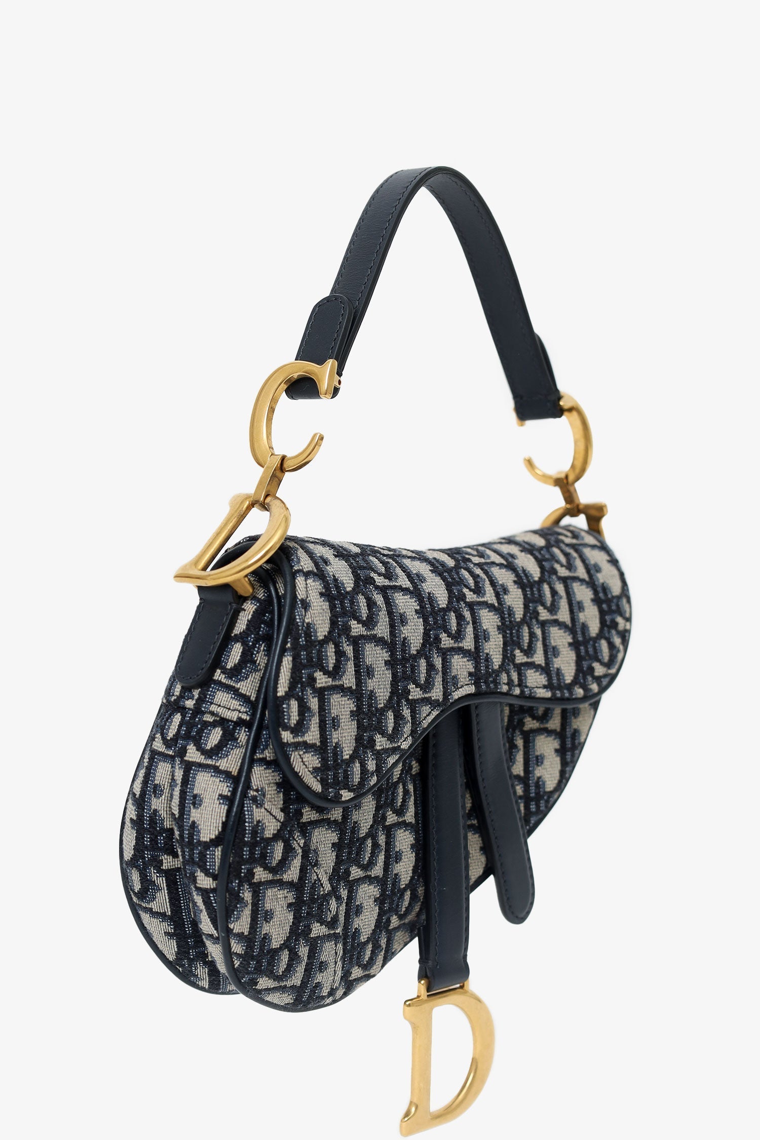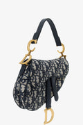 Christian Dior 2019 Blue Oblique Jacquard Mini Saddle Bag With Strap. Front fold-flap magnetic closure. Leather top strap with decorative logo hardware. Additional removable crossbody strap with lobster-clasp closure. 1 exterior rear slip pocket. Open canvas-lined interior. Gold-silver-tone hardware. Tonal stitching.