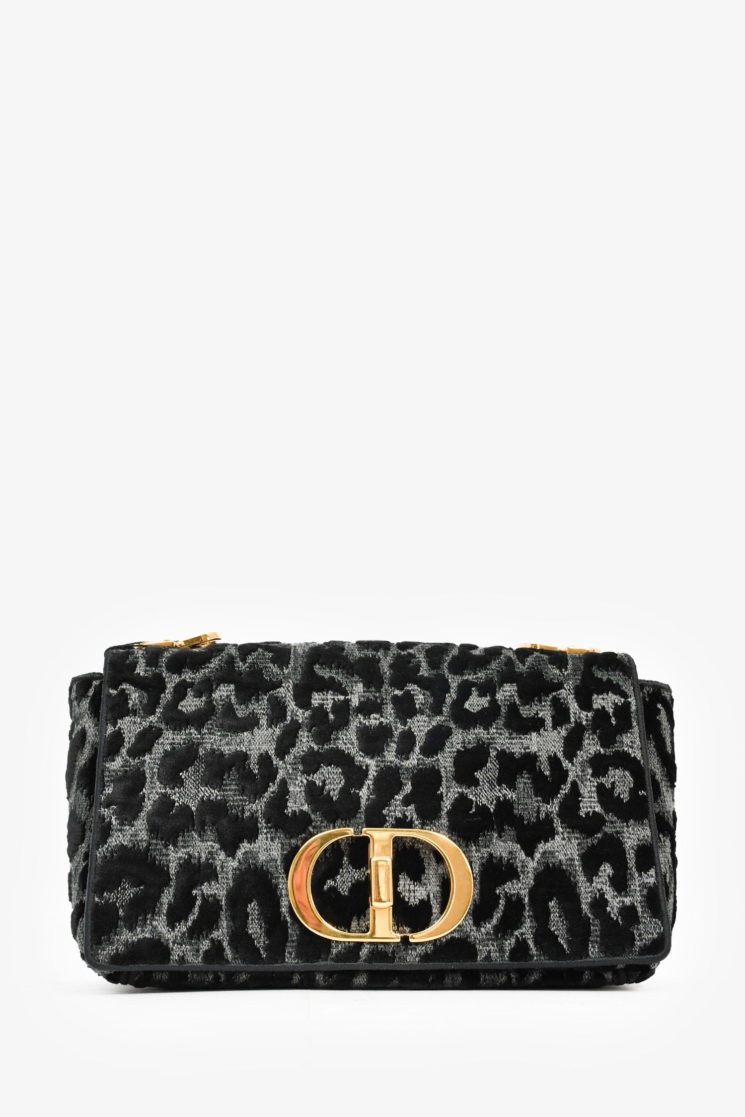 Christian Dior 2021 Black Grey Velvet Leopard Print Medium Caro Bag. Front flap with gold-tone CD twist-lock closure. Adjustable leather-threaded chain shoulder strap. Single interior slip pocket. One back exterior pocket. Tonal stitching.