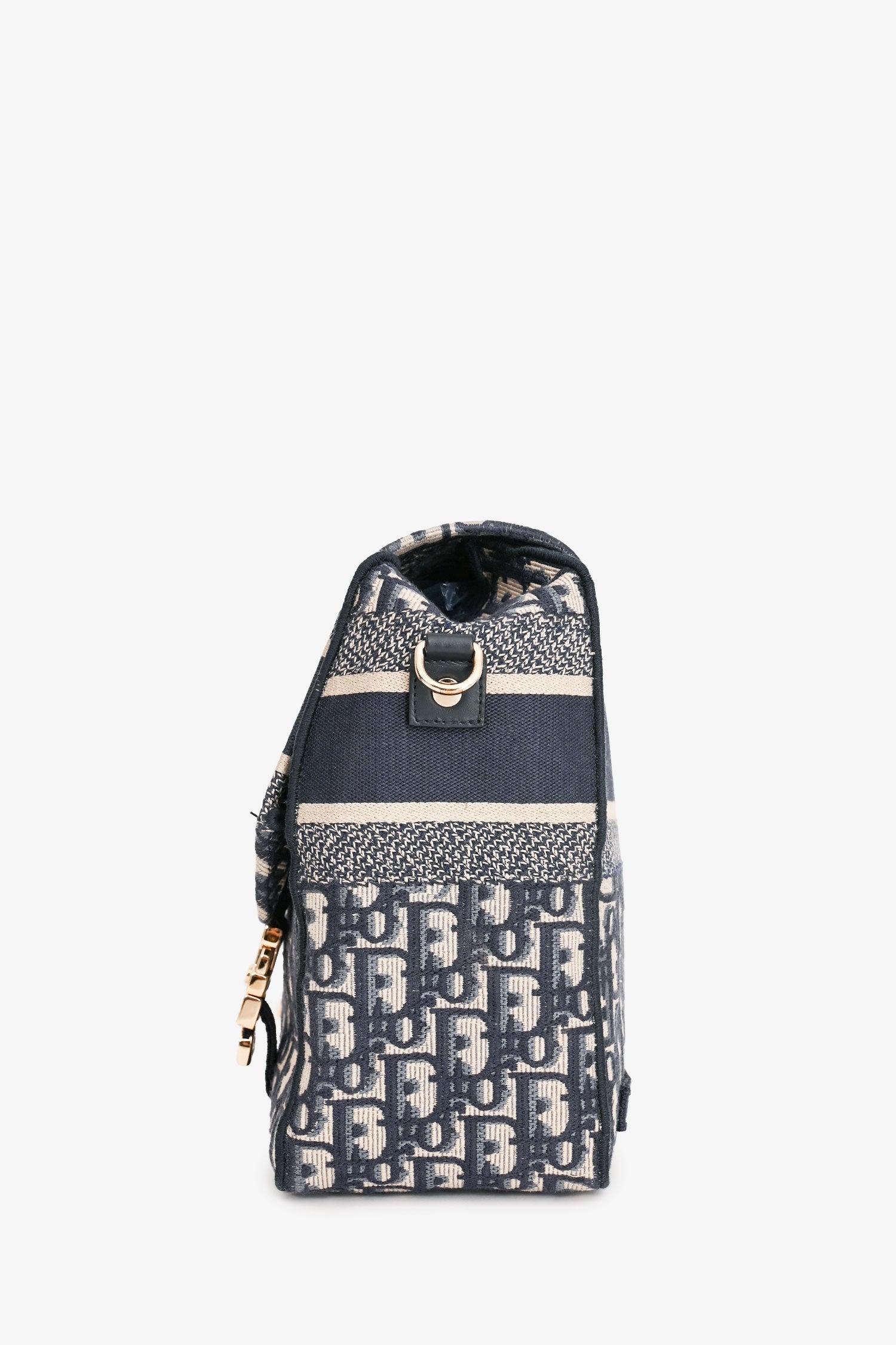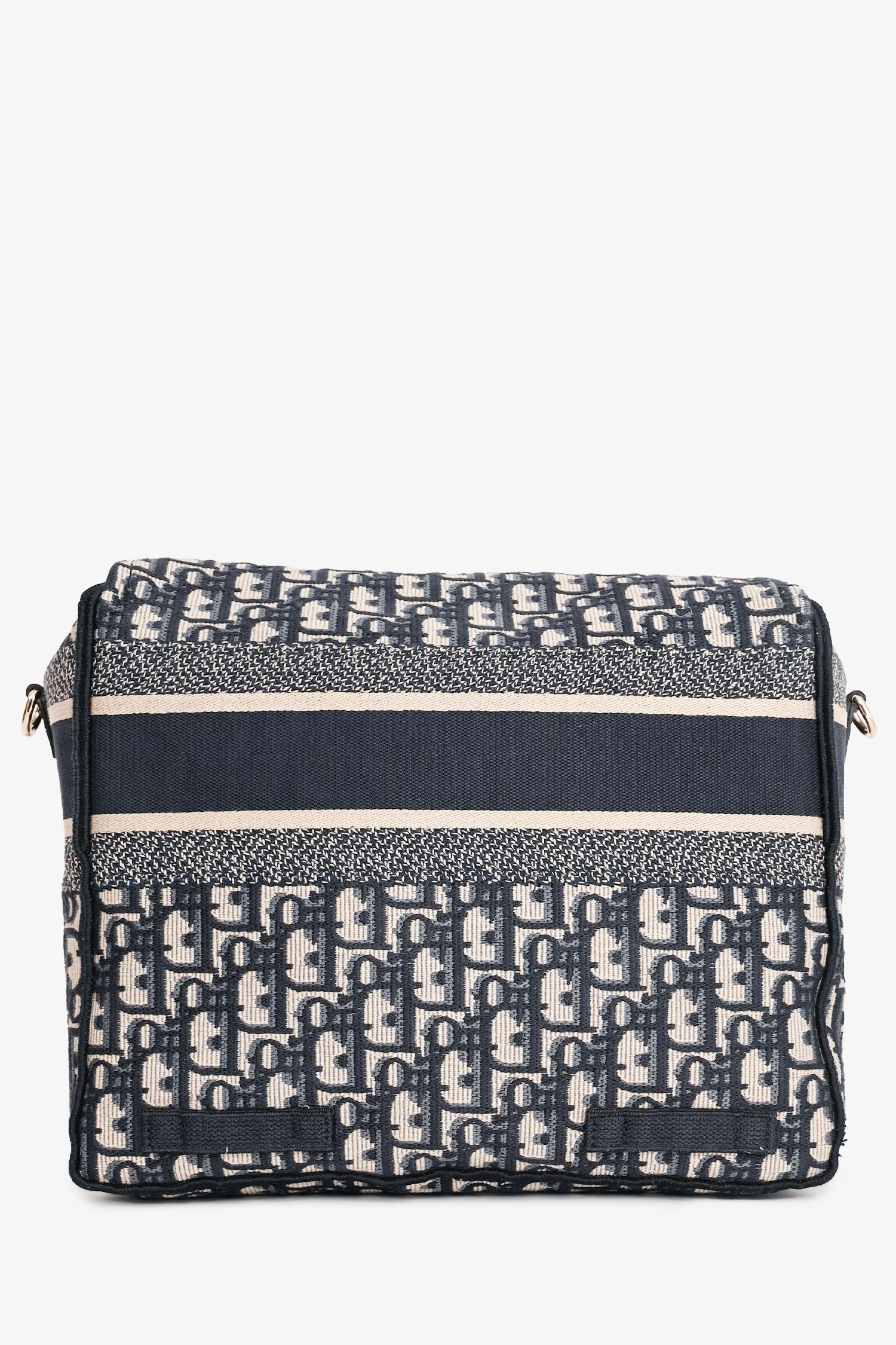 Christian Dior 2022 Navy Oblique Medium Diorcamp Bag. Front flap with buckle closures. Adjustable shoulder strap. Detachable strap. Gold-tone hardware. Tonal stitching.