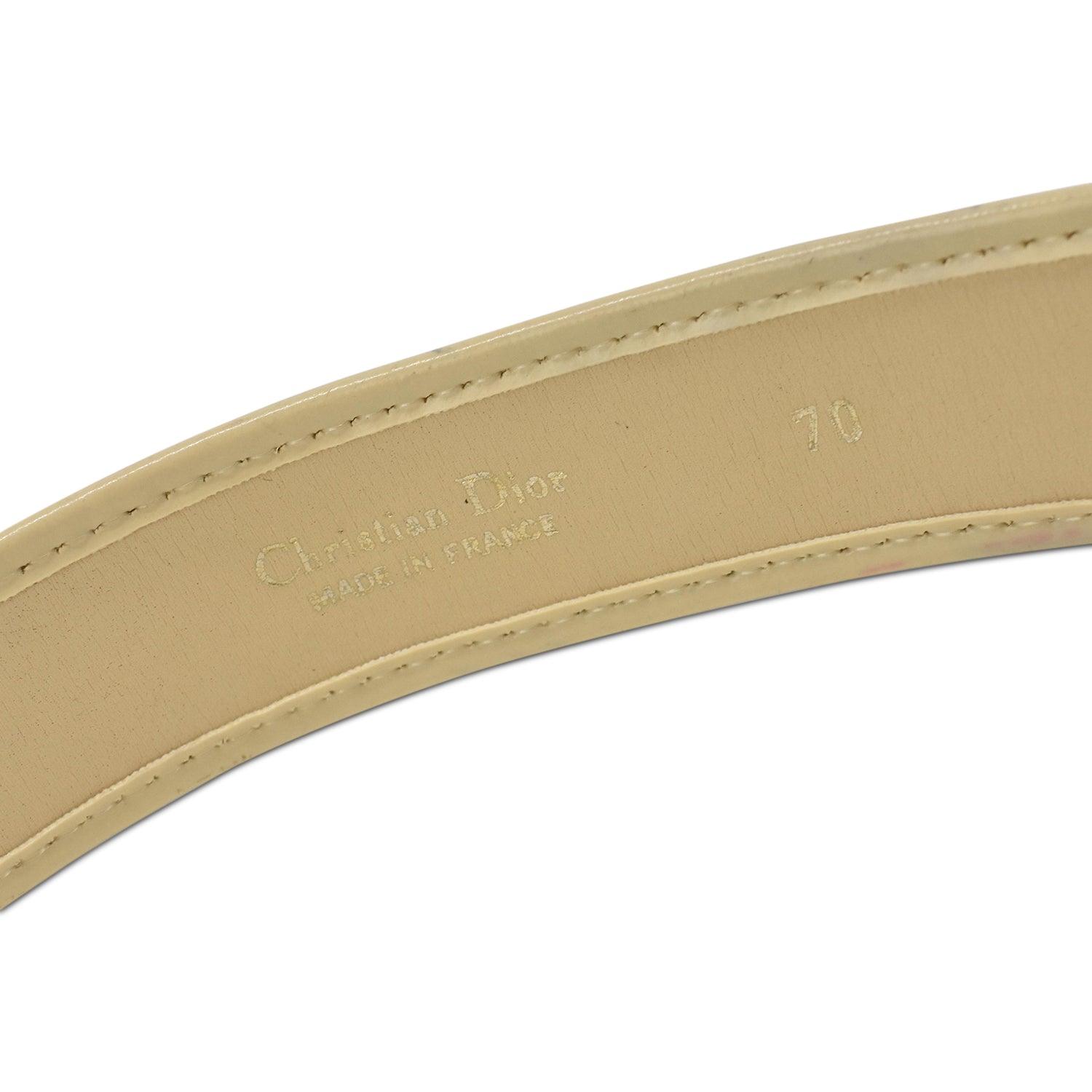 Christian Dior belt in cream canvas with matching patent leather trim and gold hardware. Features diorissimo logo print throughout and buckle with geometric CD logo.