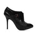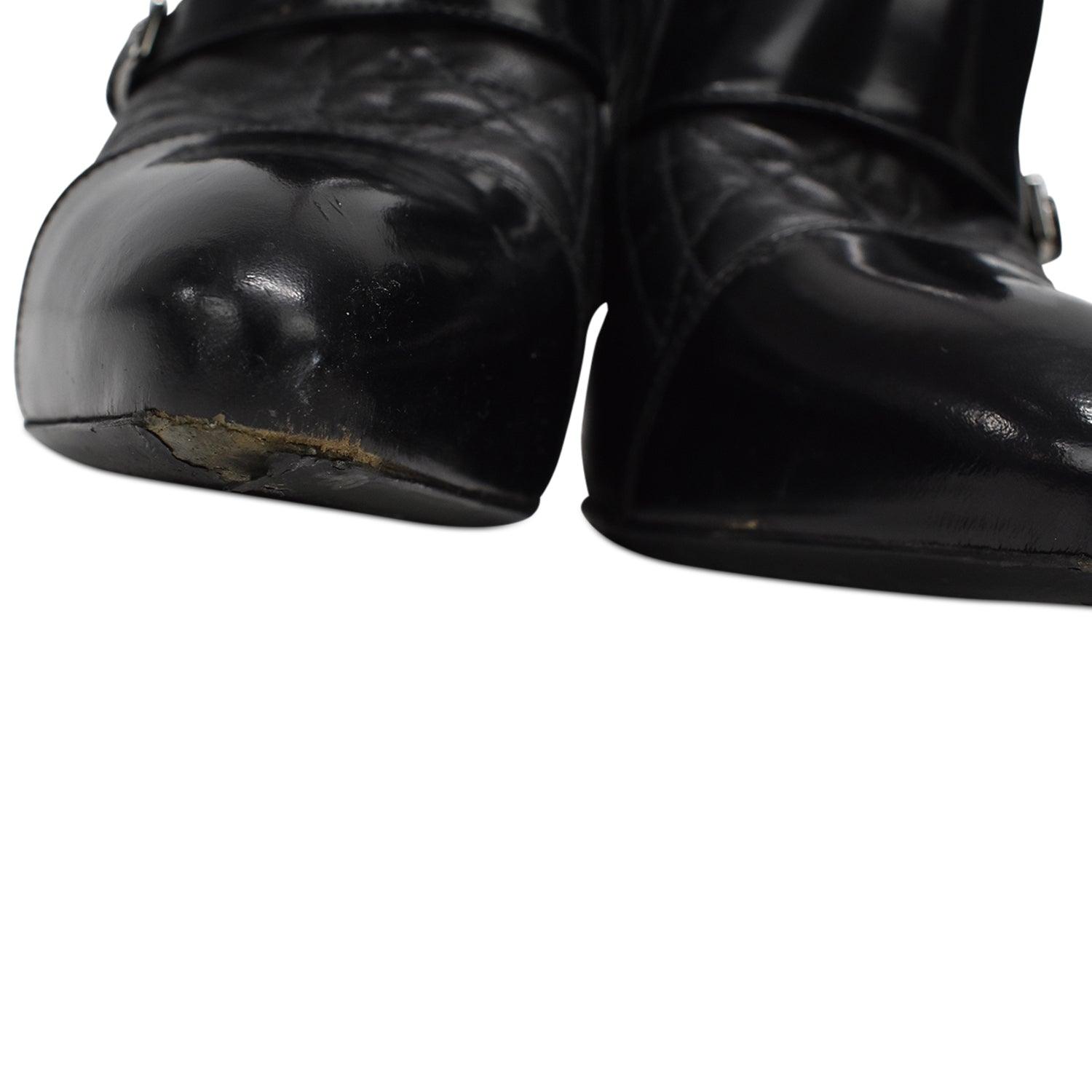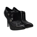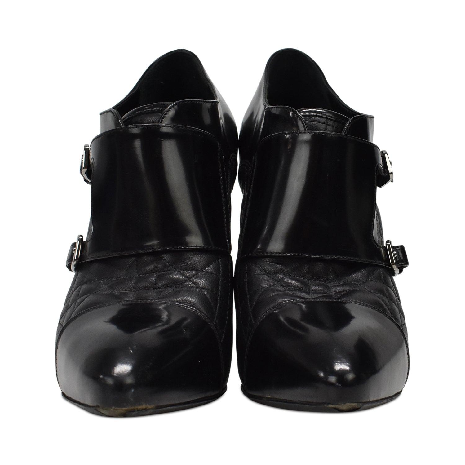 Christian Dior Booties in black cannage quilted leather with a patent leather pointed toe and, stiletto heel and two monk buckle strap closure in silver hardware.