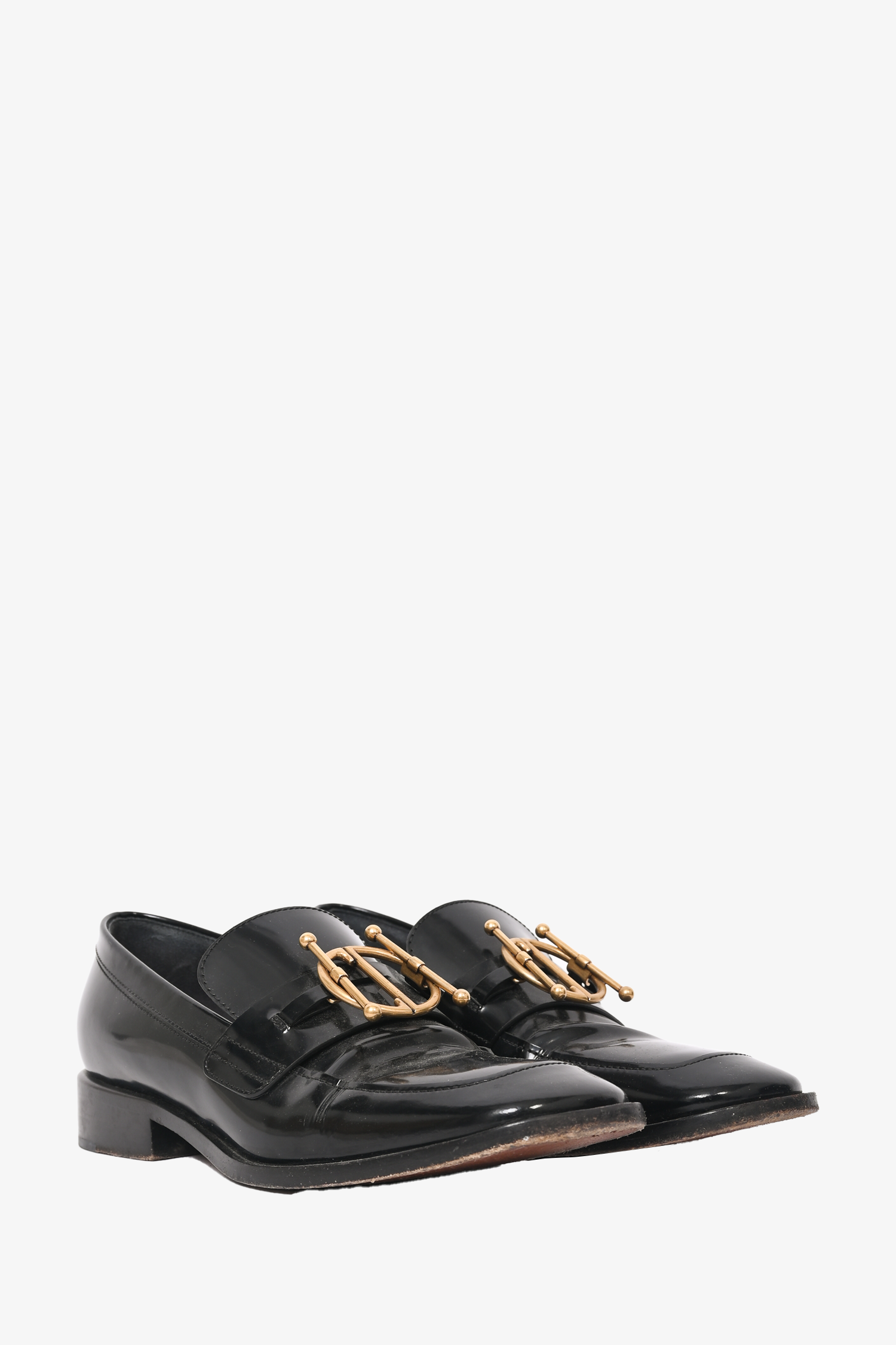 Christian Dior Black Brushed Leather 'Direction' Loafers. Square toe. Gold-tone hardware. Tonal stitching.
