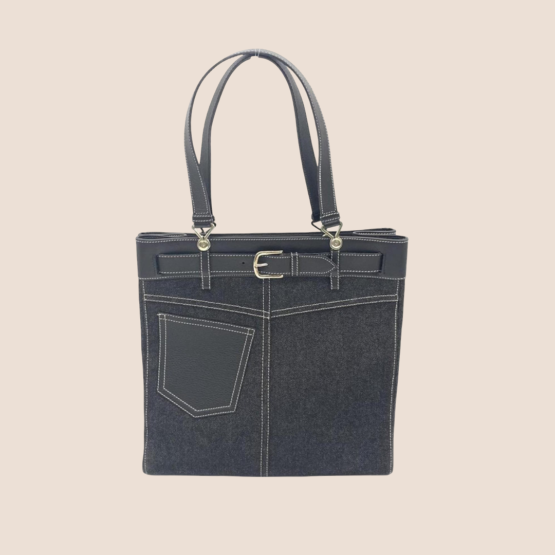 CHRISTIAN DIOR BLACK DENIM & LEATHER BELTED EVERYDAY TOTE BAG