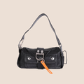 The bag features black leather body, silver-tone hardware, 'REMOVE BEFORE FLIHGT" orange bag charm and a single shoulder strap.