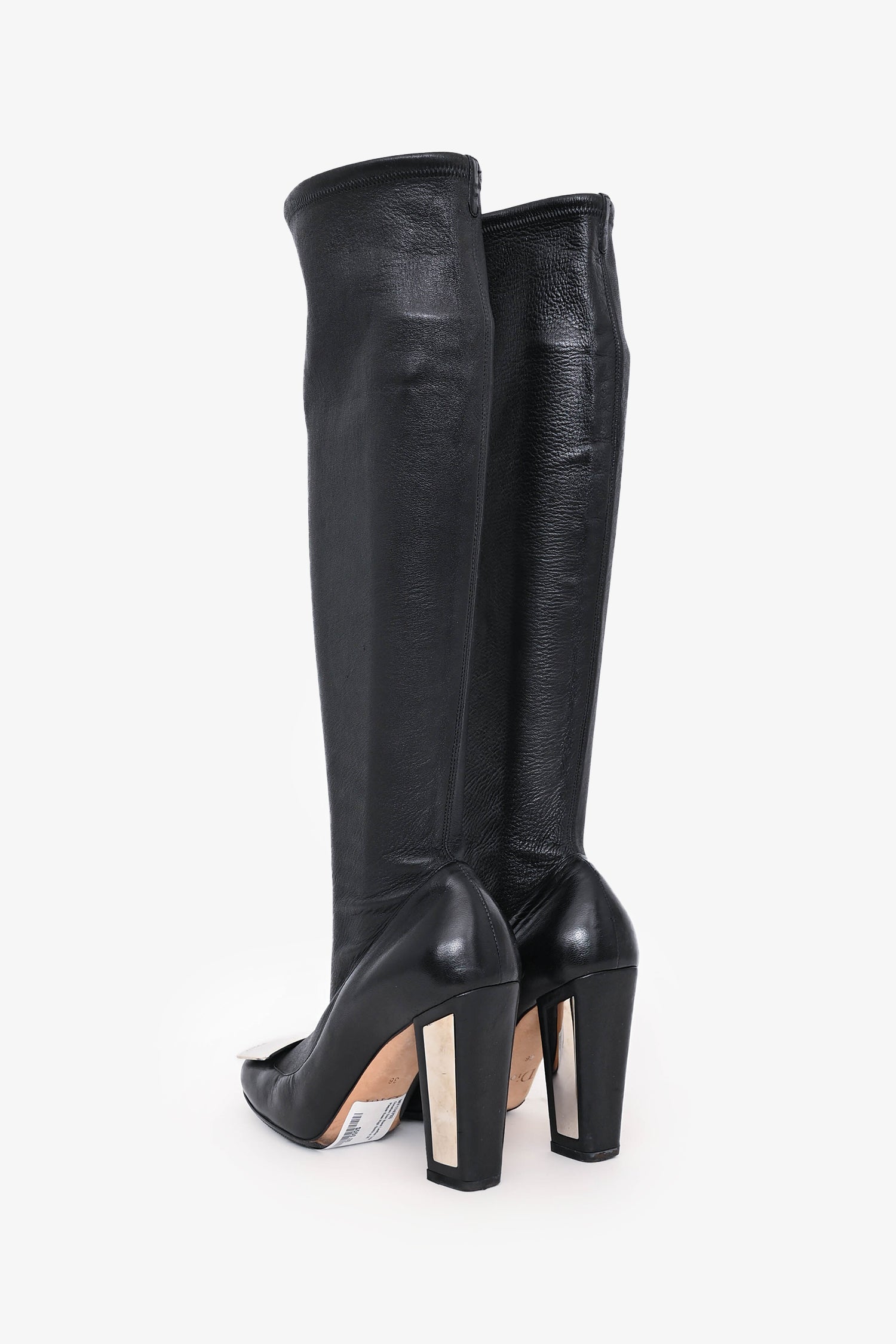 Christian Dior Black Leather Logo Plaque Knee High Boots. Round toe. Leather insole. Two exterior contrast leathers. Suede sole with ribbed detailing. Plaque detailing on the heel. Engraved logo on toe plaque. Silver-tone hardware. Tonal stitching.