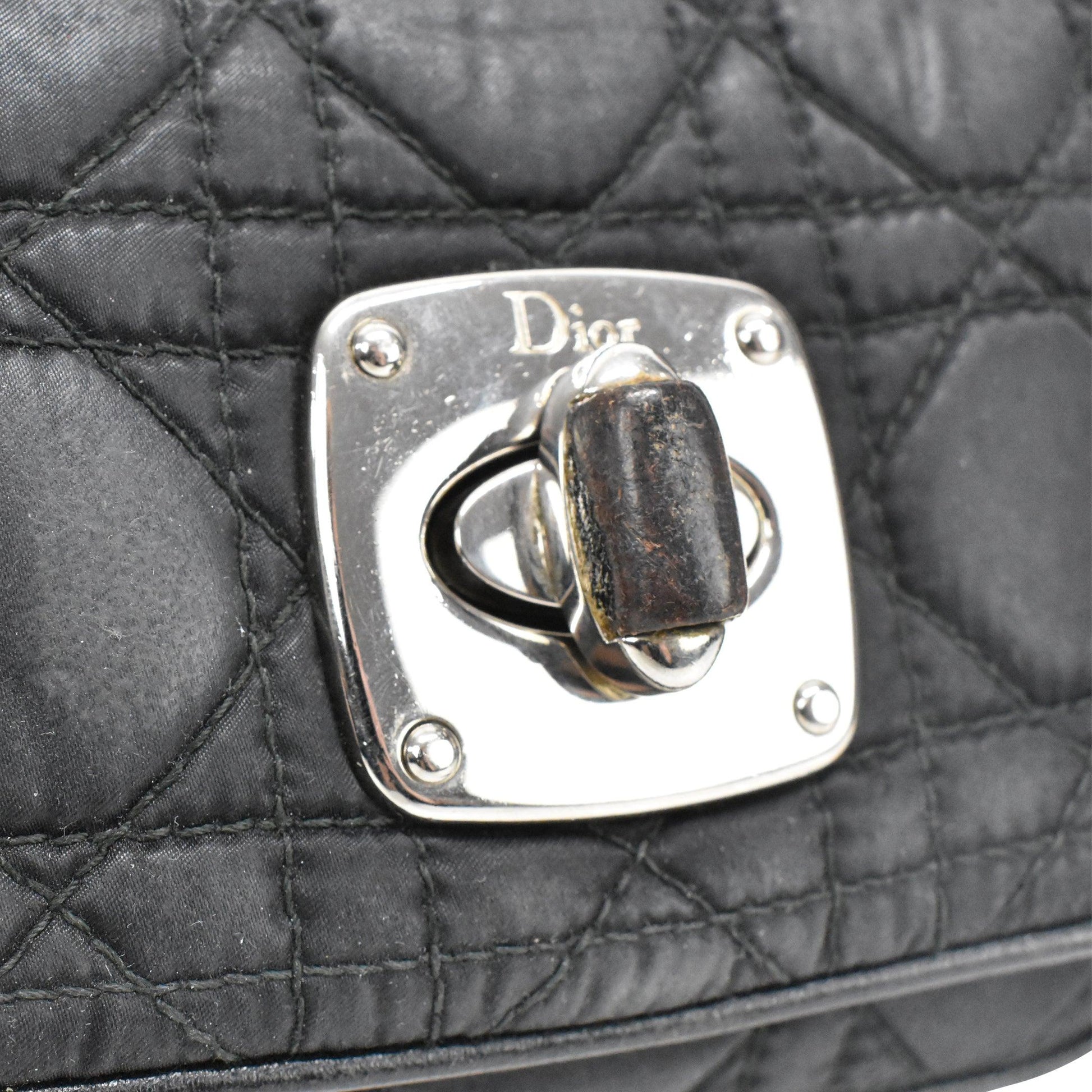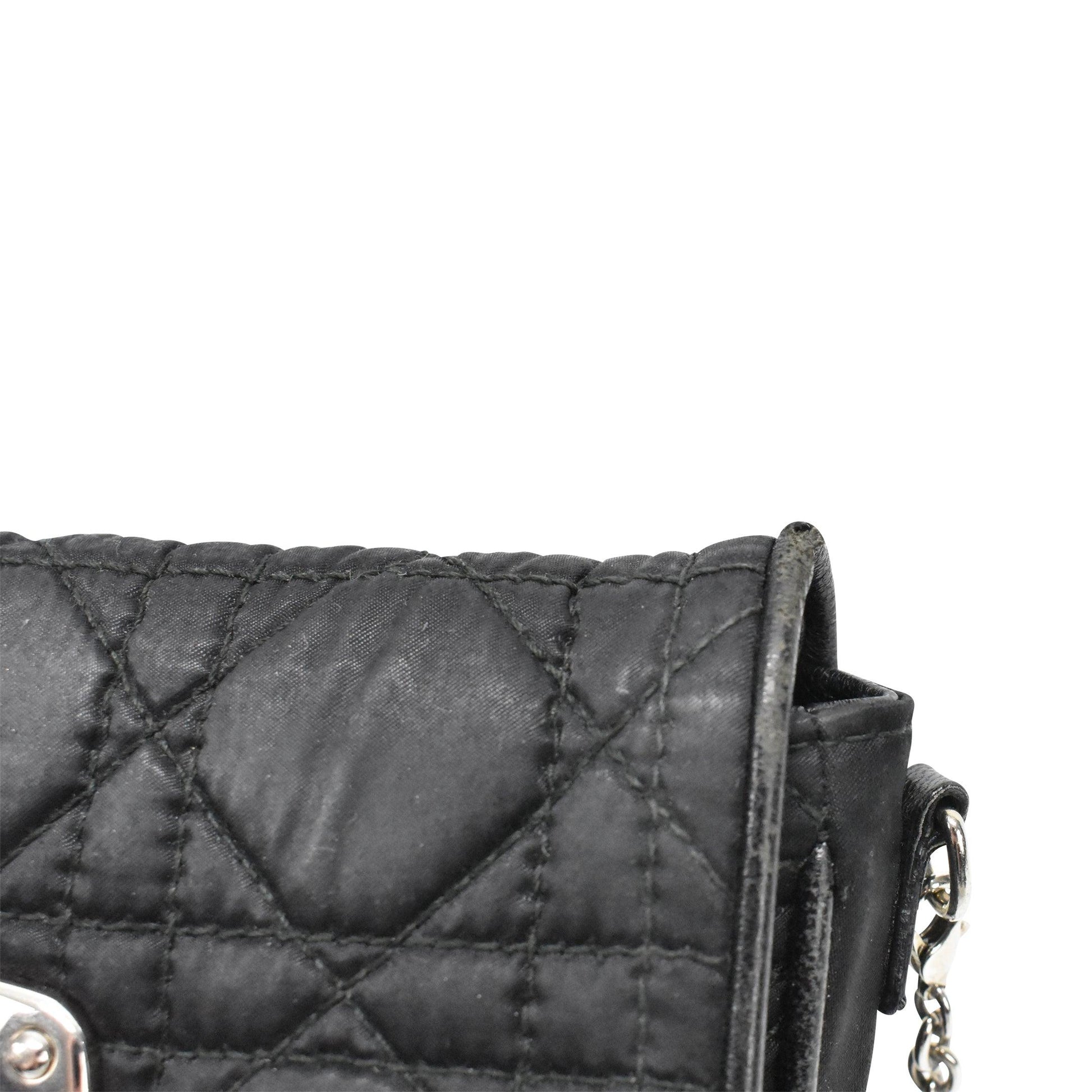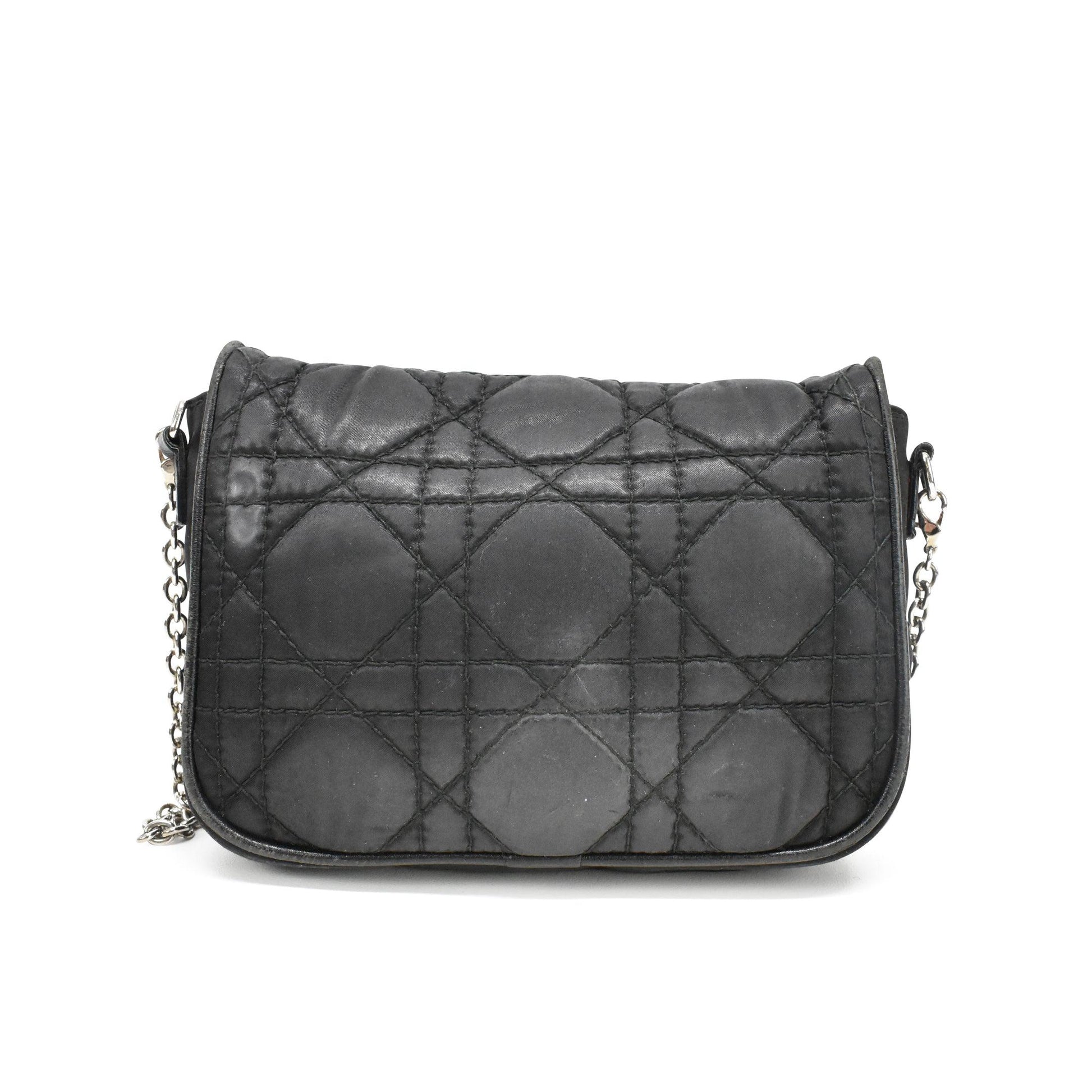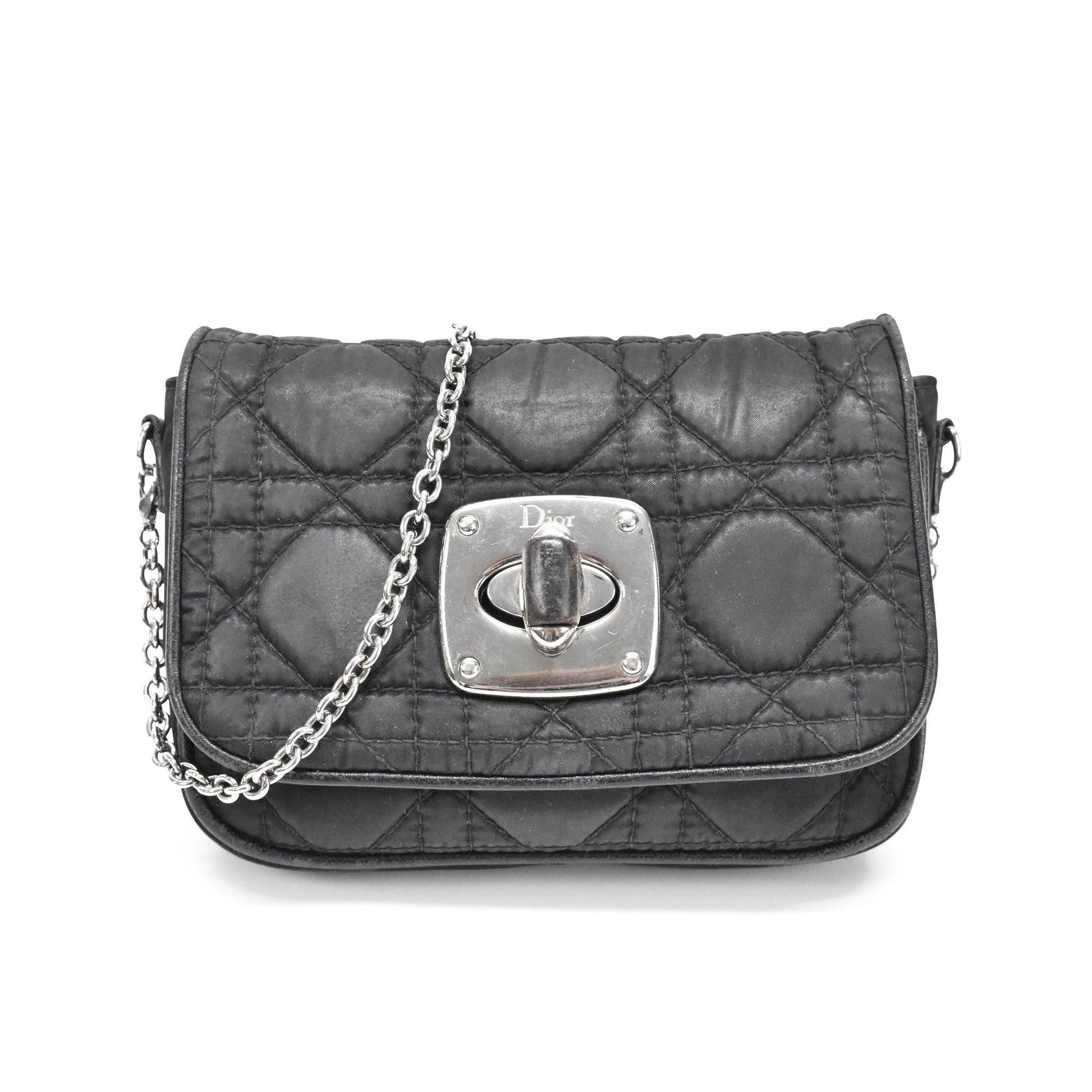 Christian Dior Mini Crossbody Bag in black cannage quilted nylon with front flap turnlock closure in silver hardware. Features a chain crossbody strap and two inner card slots.