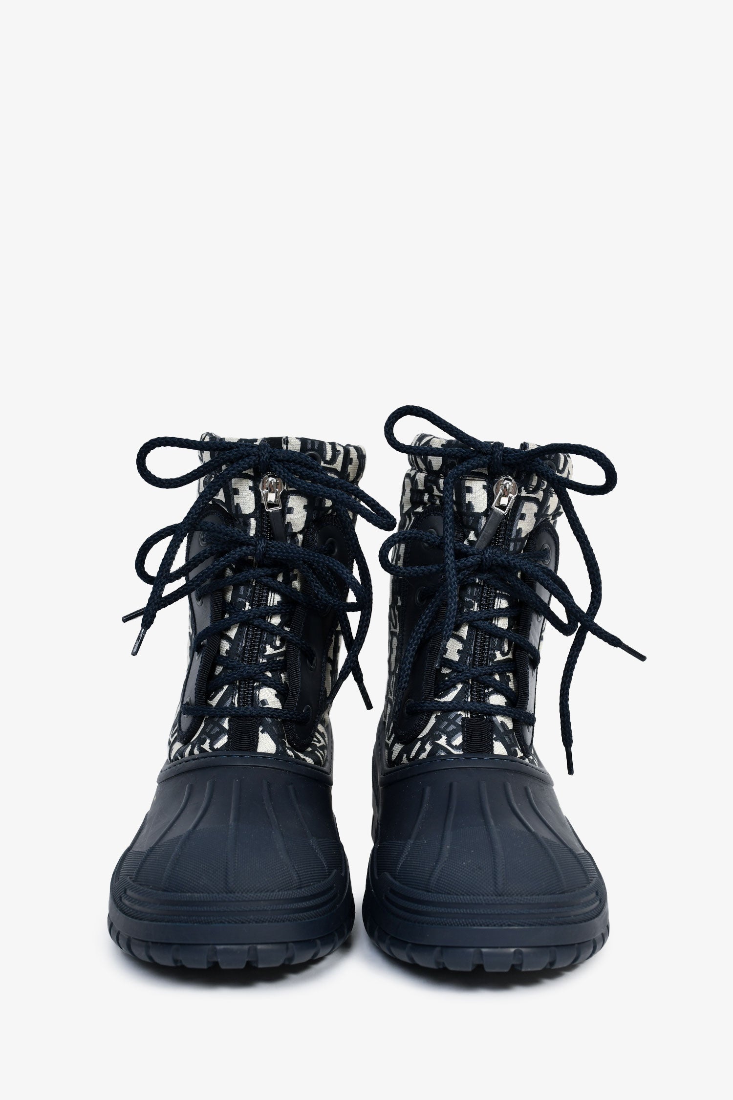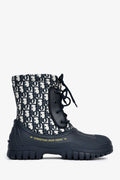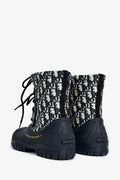 Christian Dior Blue Oblique D-Venture Jacquard Boots. Almond toe. Front lace-up closure. Fleece lining. Tonal stitching.