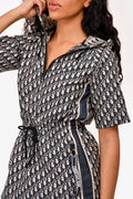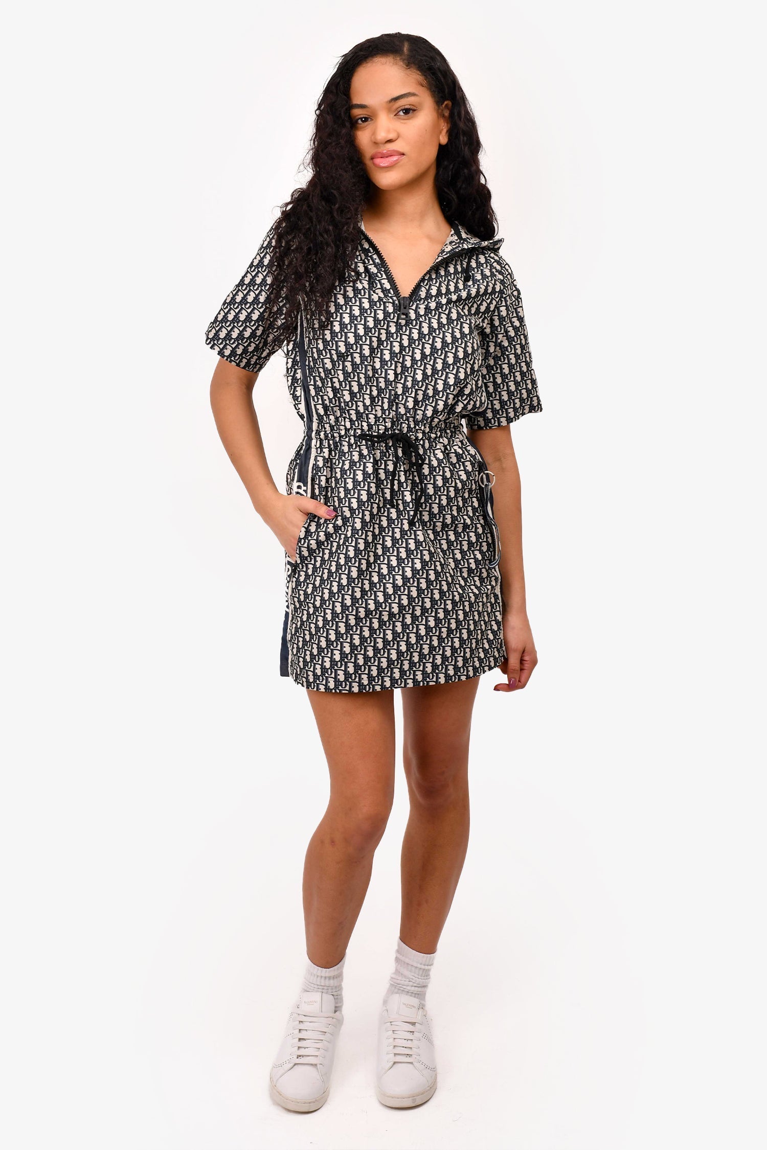 Christian Dior Blue Oblique Jacquard Hooded Mini Dress. Pull-over design with zipped neckline. Drawstring adjustable cinched waistline. Unlined. Tonal stitching.