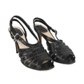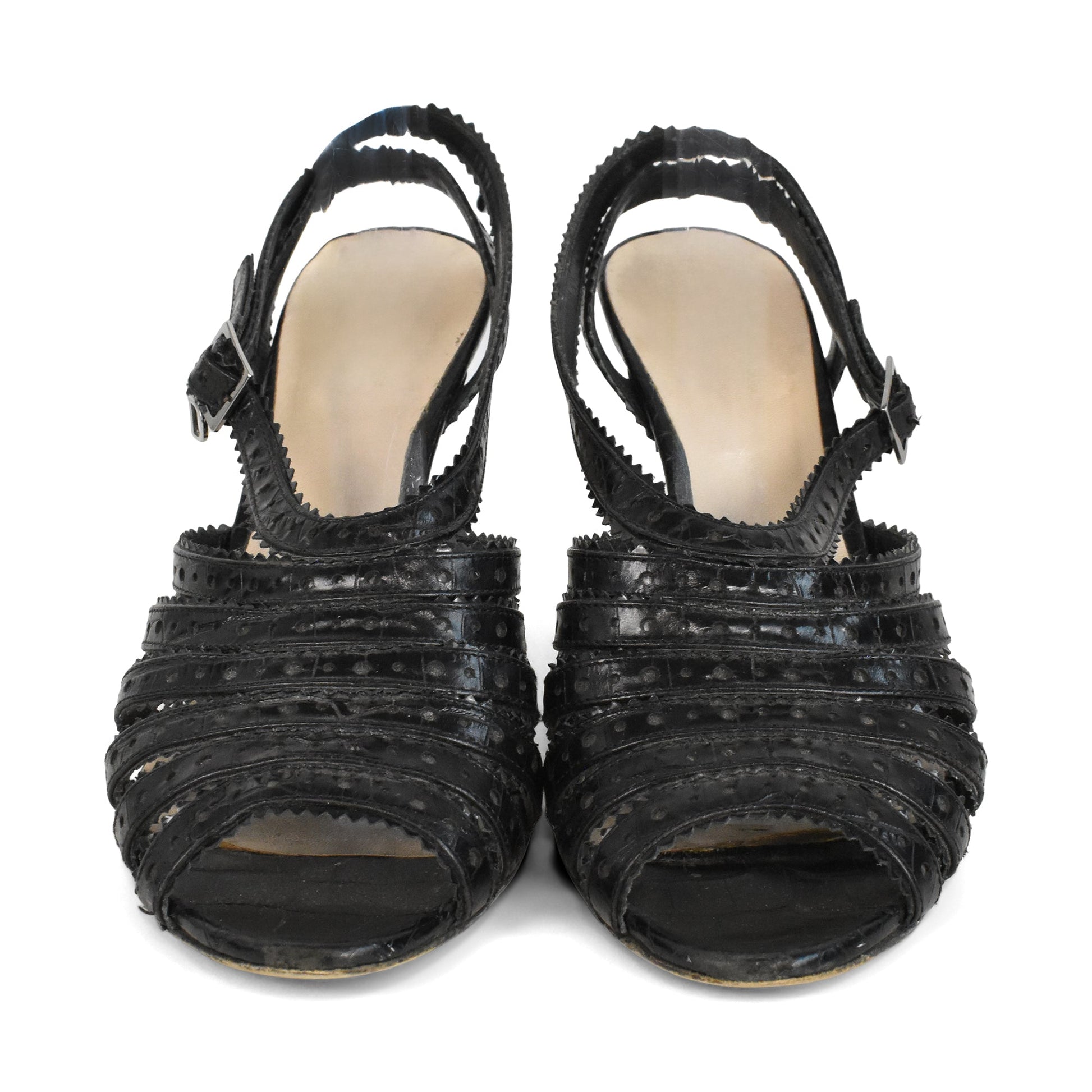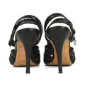 Christian Dior 'Bonnie' strappy heels in black croc emboosed leather with wrap around ankle strap and gunmetal hardware. The right shoe features a dangling 'D' charm on the buckle.