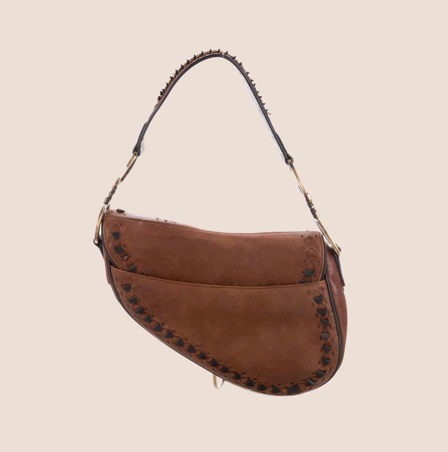 Vintage Christian Dior Brown Leather Floral Laser Cut Saddle bag.