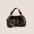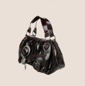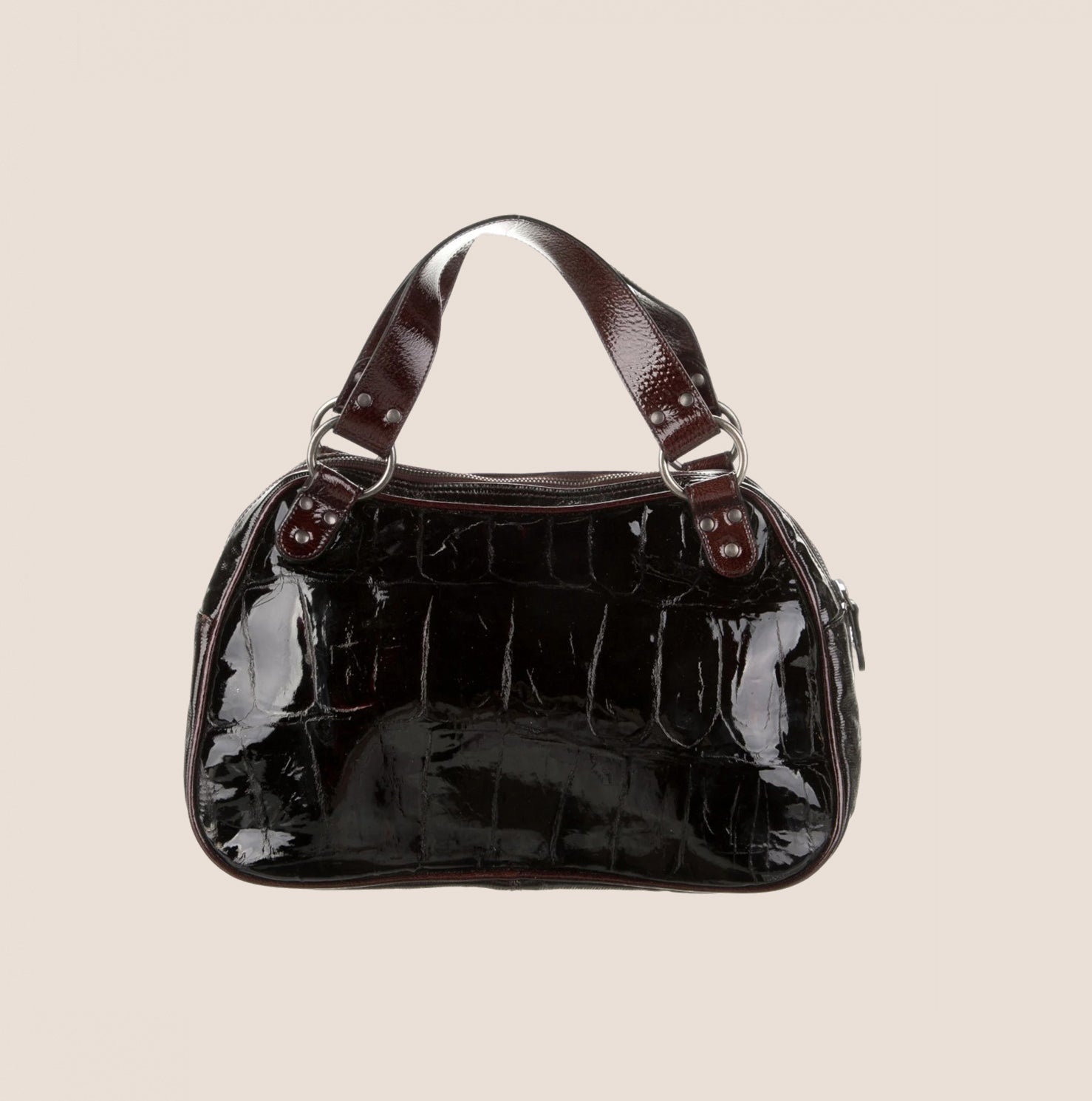 The bag features black & brown croc embossed paten leather, antiqued silver-tone hardware, two shoulder straps, logo jacquard lining and single interior pocket.