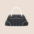 The bag features navy blue & white denim body, dual shoulder handles along with a silver-tone logo plate detail on the front.