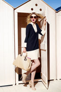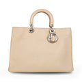 Christian Dior 'Diorissimo' tote bag in beige smooth leather with two flat top handles and silver hardware. Features silver hardware 'Dior' letter charm, a removable and adjustable shoulder strap, adjustable buttons on the side pleats, black glue trim, and a magnetic closure. The interior is magenta purple leather lined with two slip pockets.