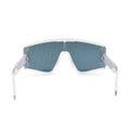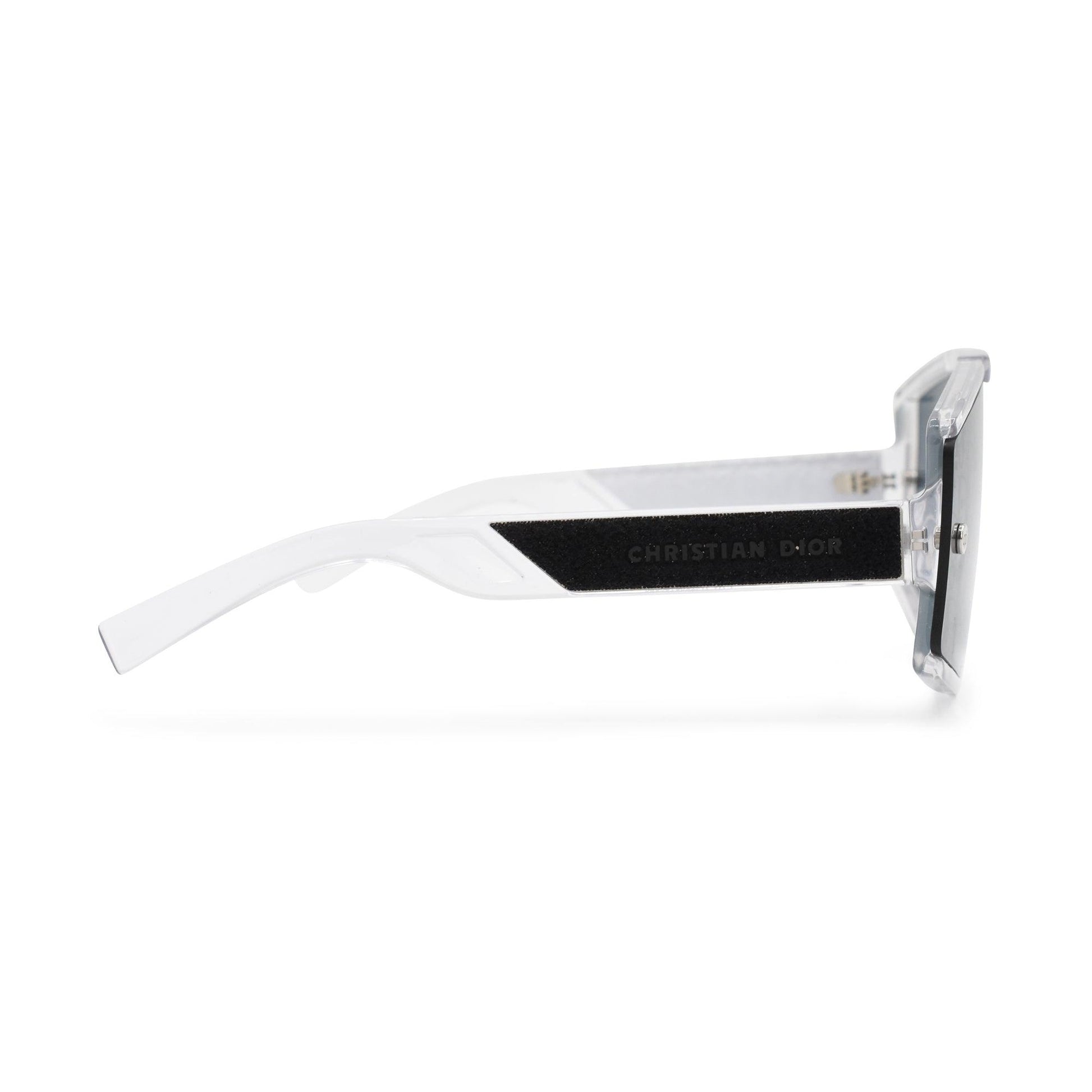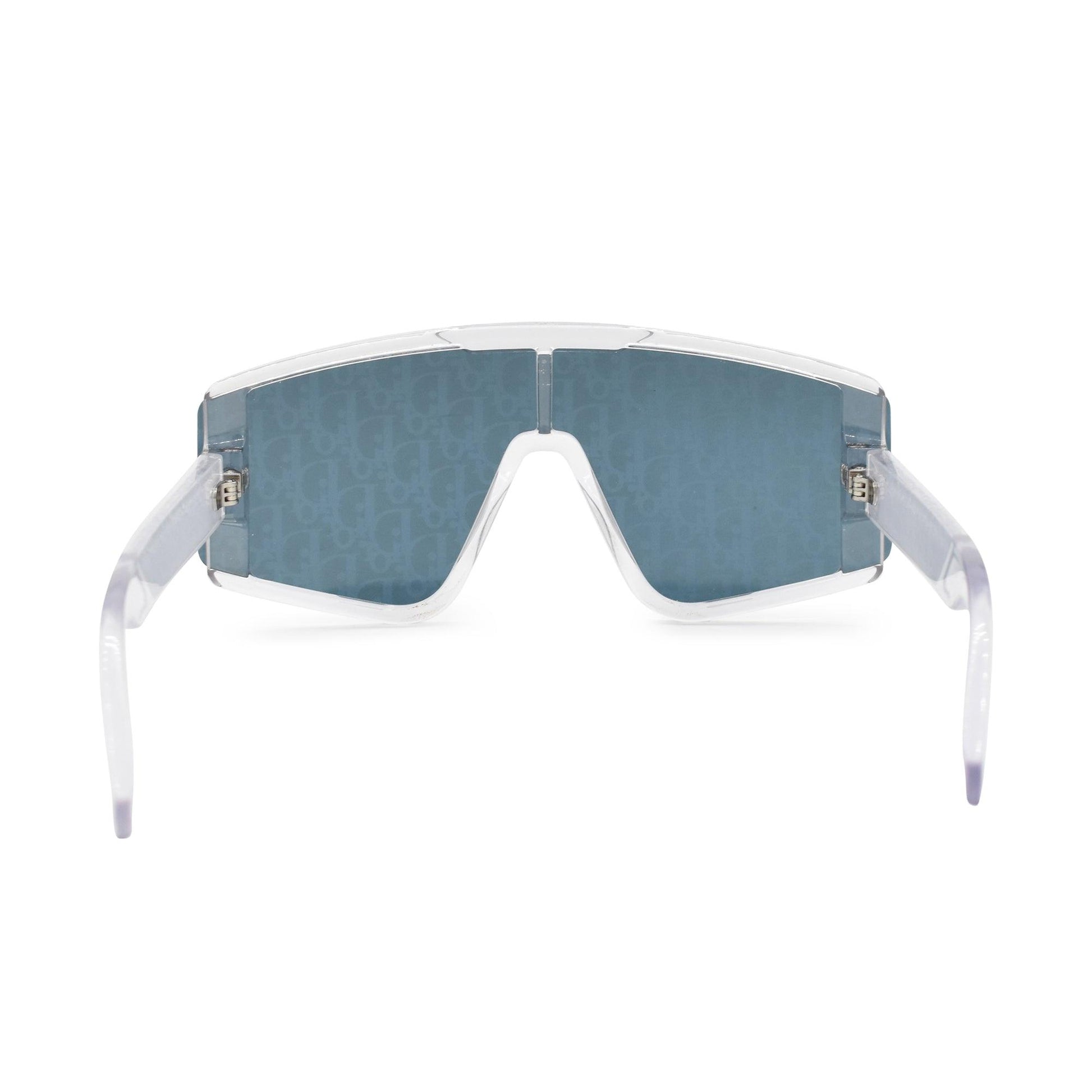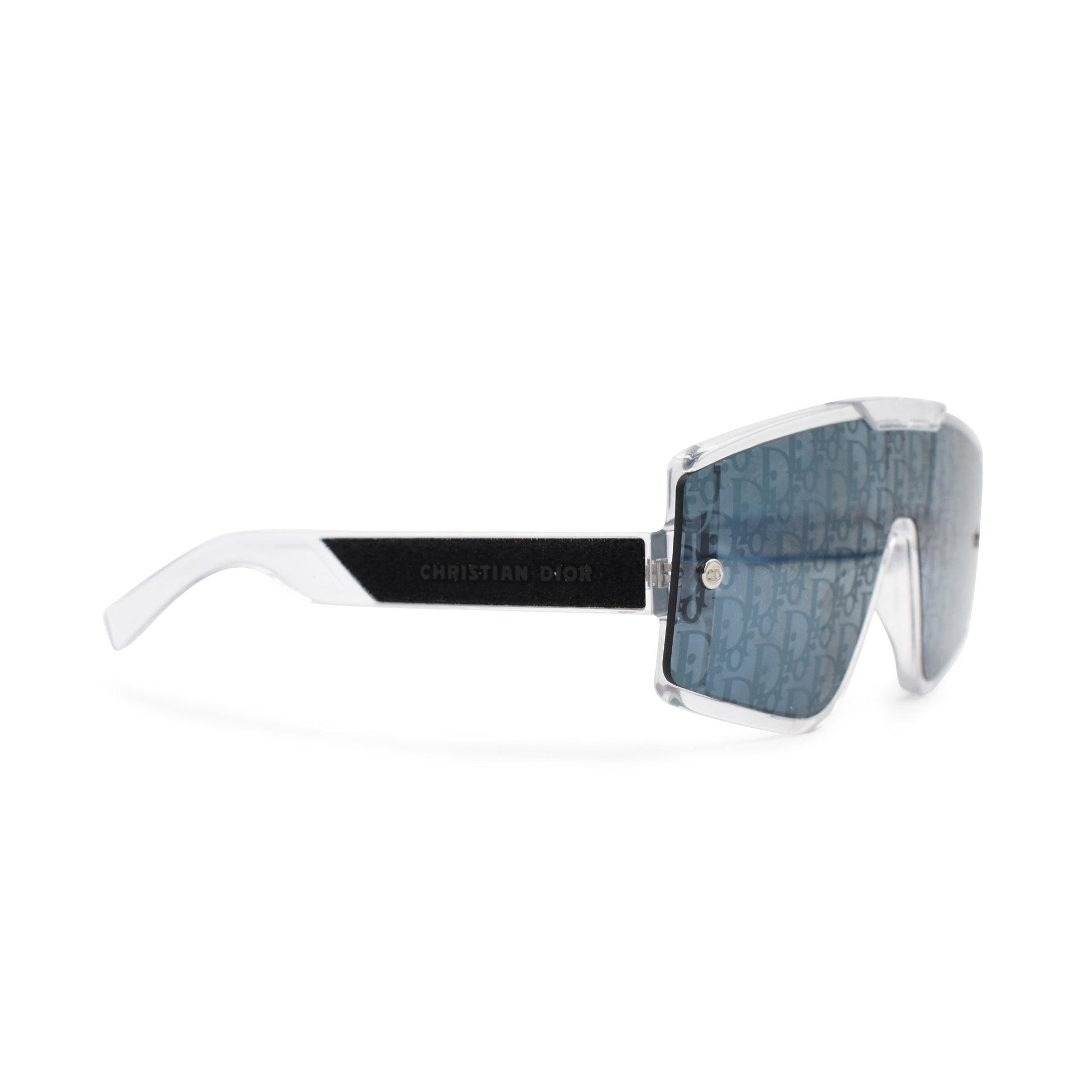 Christian Dior 'DIORXTREME' shield sunglasses in clear plastic with a blue trotter monogram lens, initial embossed studs in silver hardware , and a black fuzzy logo panel on the arms.