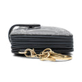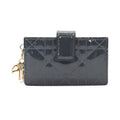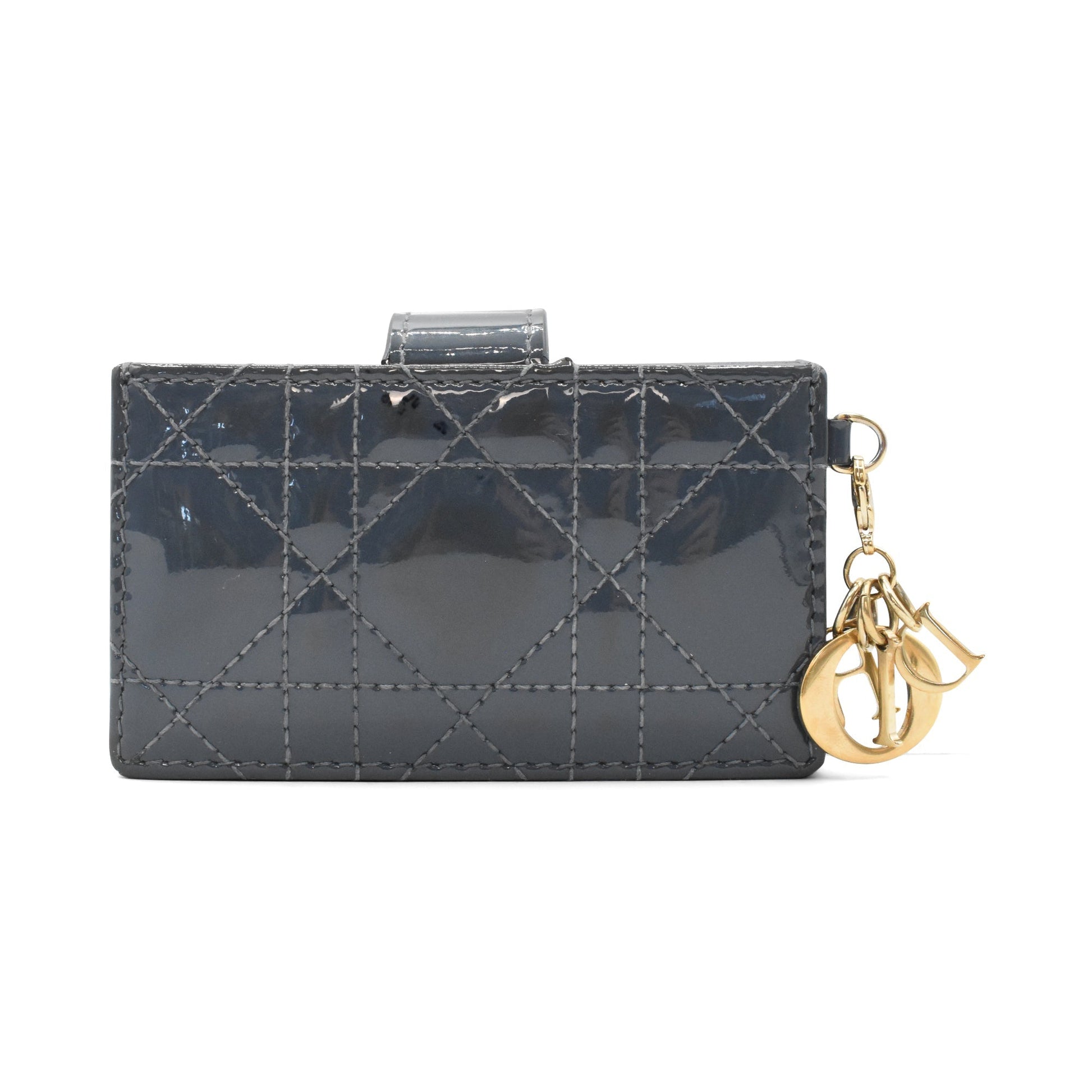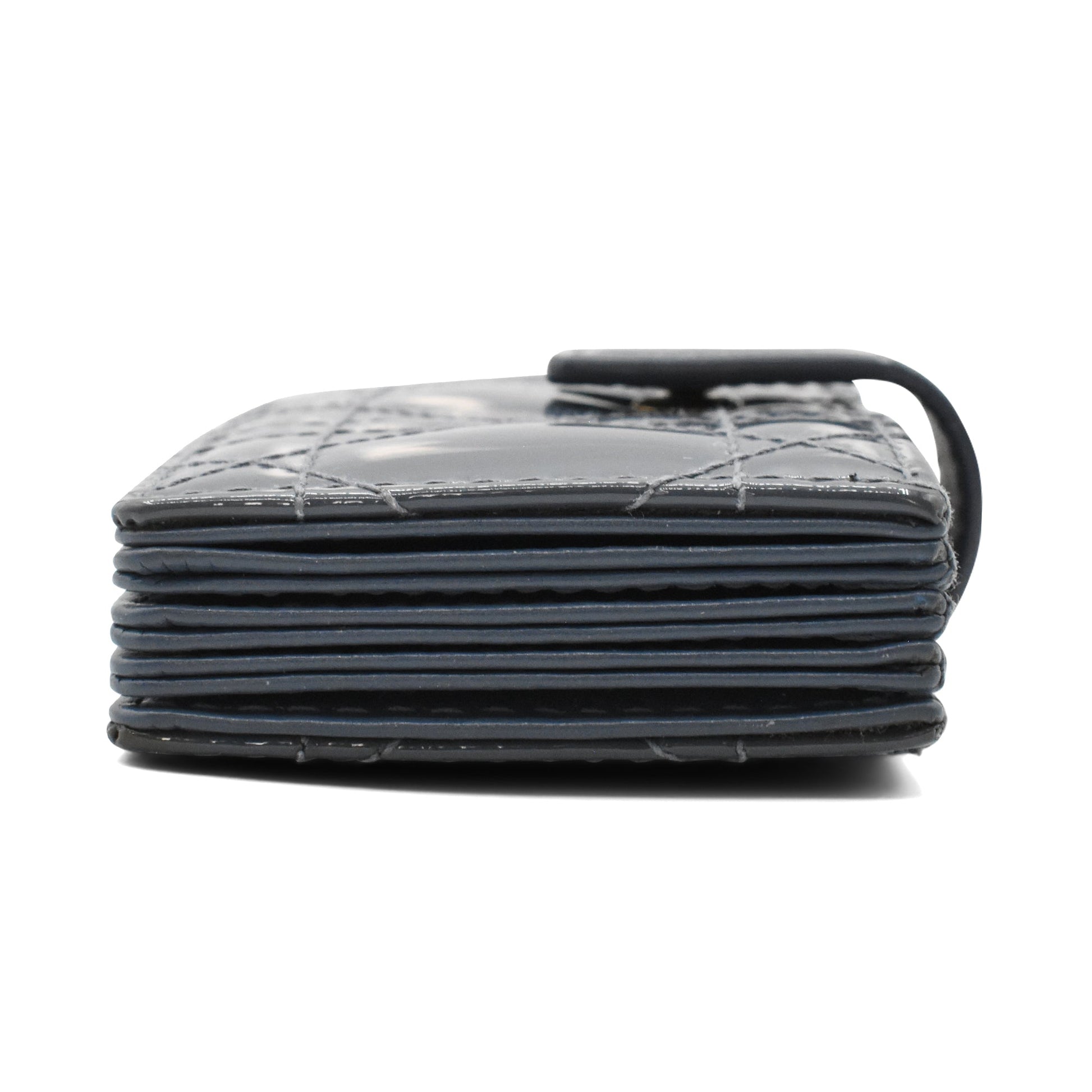 Christian Dior 'Jasmine' accordion style card holder in cannage quilted slate blue patent leather with removable Dior logo charm. Features a snap button closure and 5 card slots.