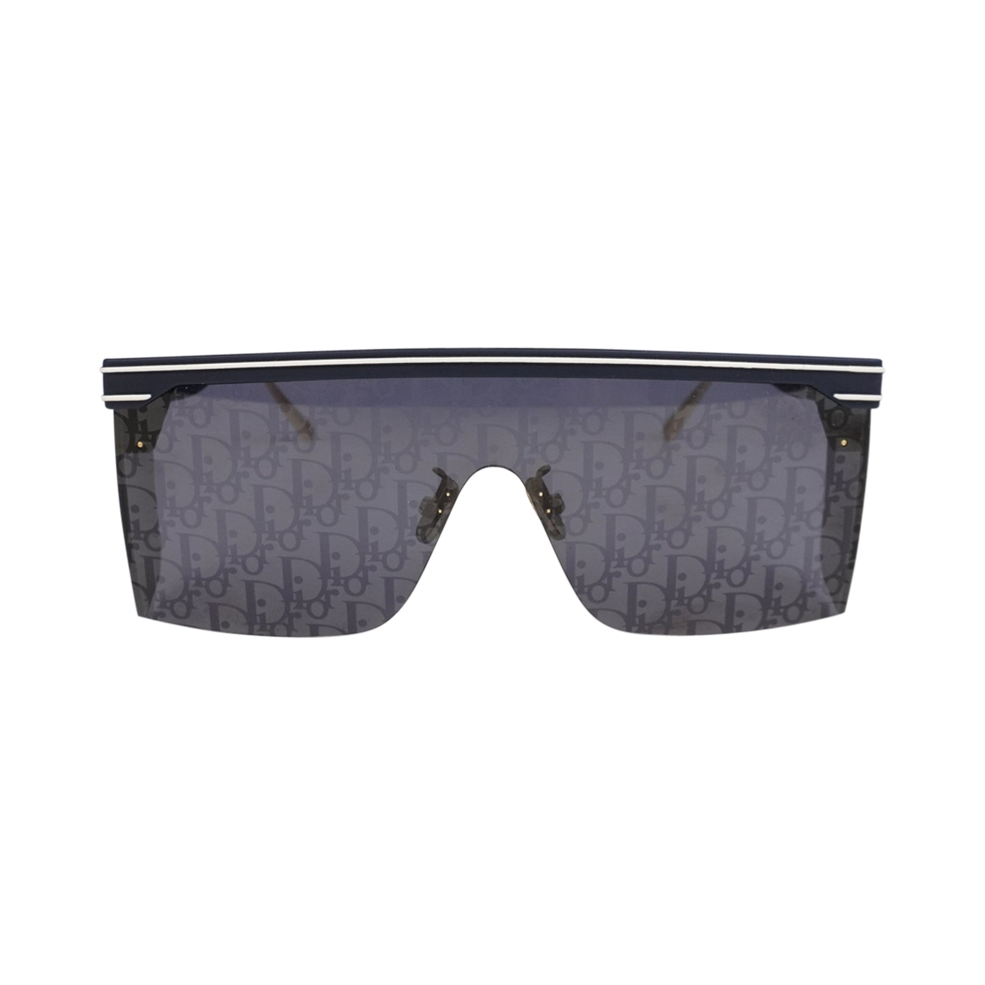 Christian Dior 'Diorclub' Shield Sunglasses in navy blue acetate with white stripes and logo detailing on the arms. Features monogram lens and gold arm detailing.