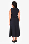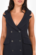 Christian Dior Navy Wool Double Breasted Sleeves Blazer Style Long Dress. Peak lapel collar. Double-breasted button front closure. Sleeveless. Tonal stitching.