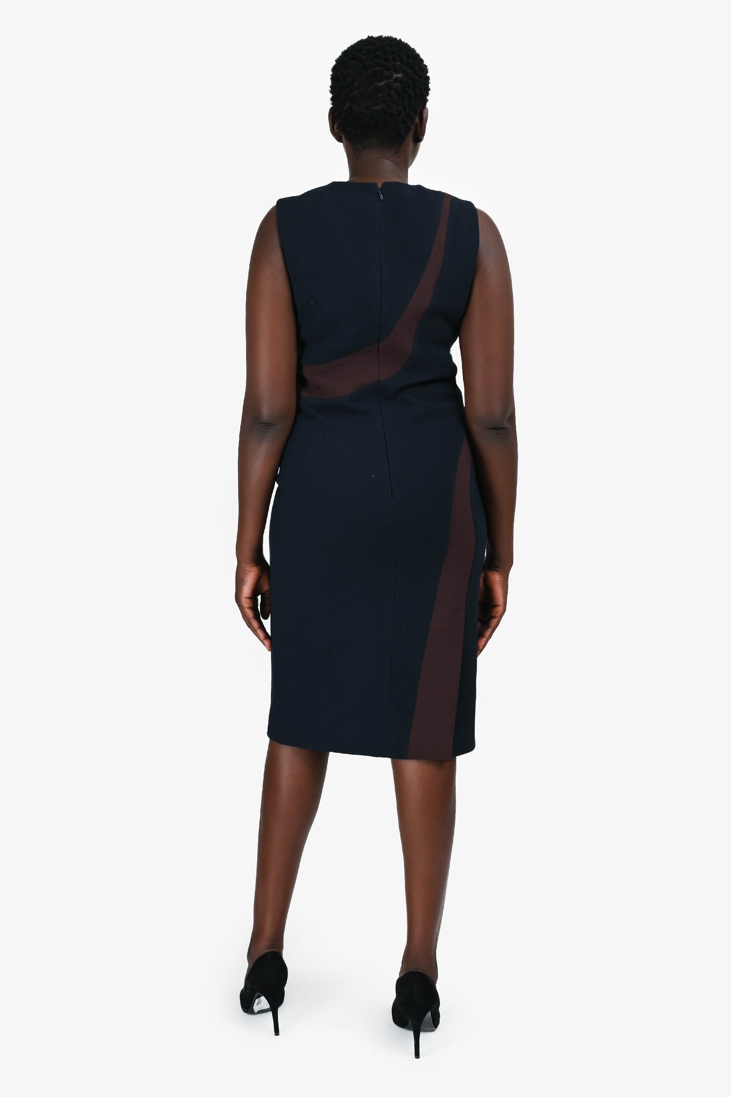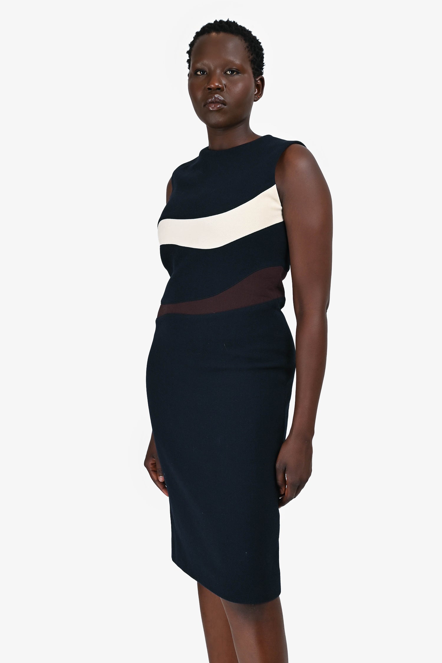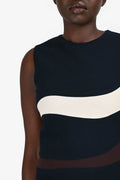 Christian Dior Navy Wool White/Brown Stripe Sleeveless Midi Dress. Round neck. Rear zip and hook closure. Lined.