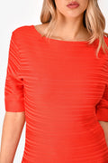 Christian Dior Red Silk Textured Midi Dress. Pull-on. Round neckline. Side zip closure. Lined. Tonal stitching.